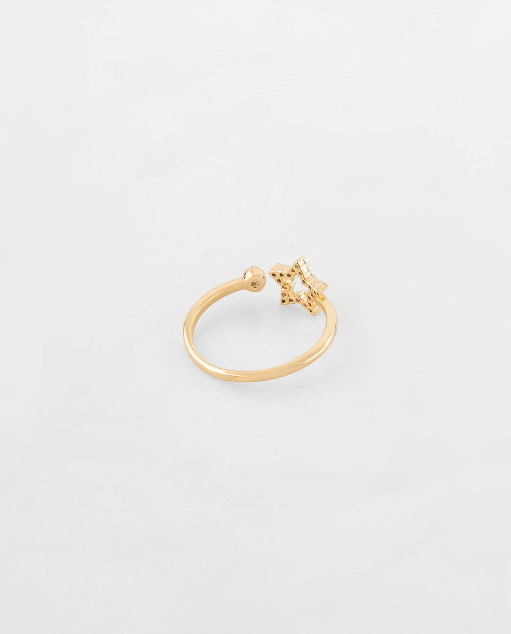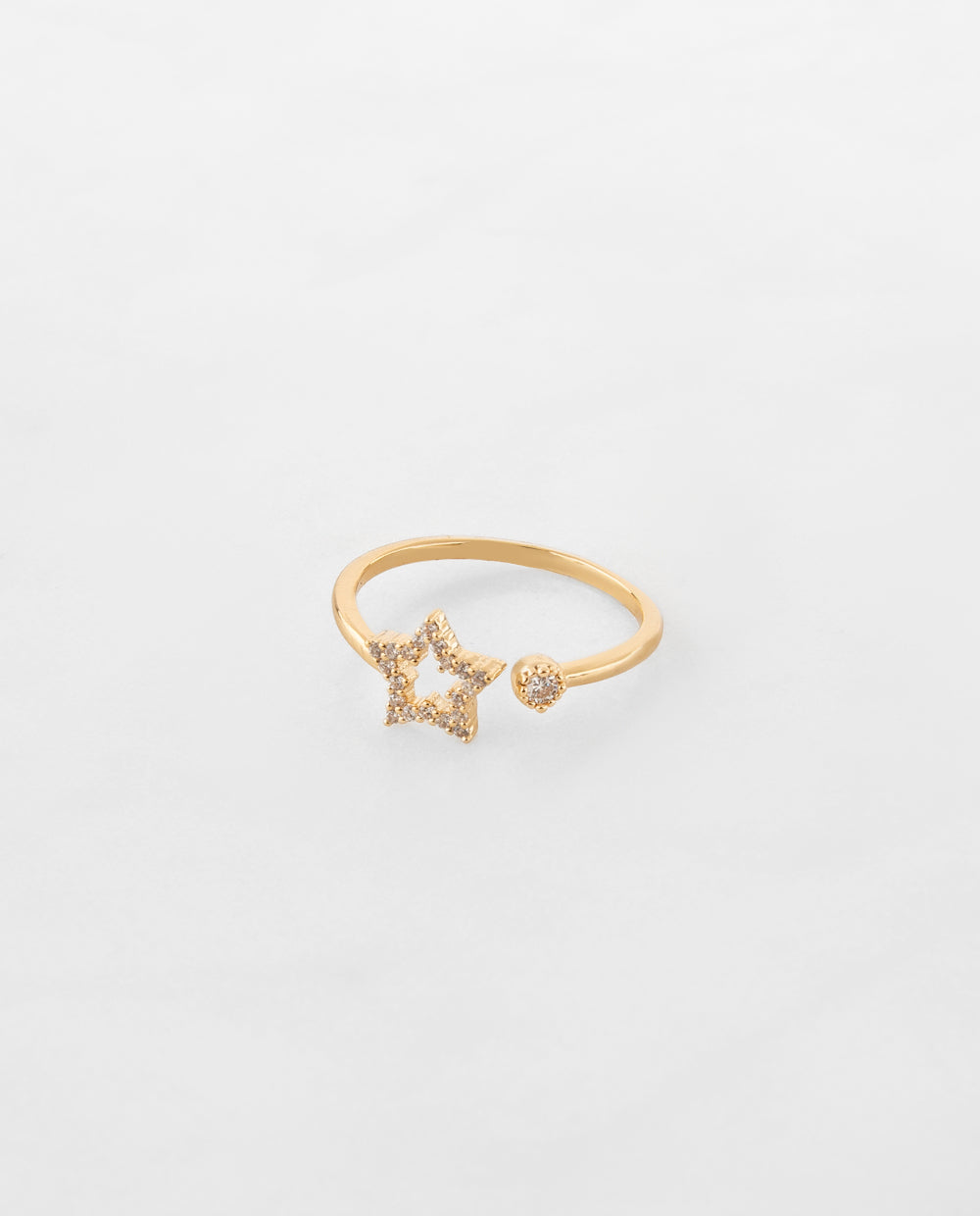 Anillo dorado bañado en oro con estrella y ajuste regulable para un calce cómodo y personalizado. Decorado con pedrería de zircón — reconocida por su brillo y durabilidad.