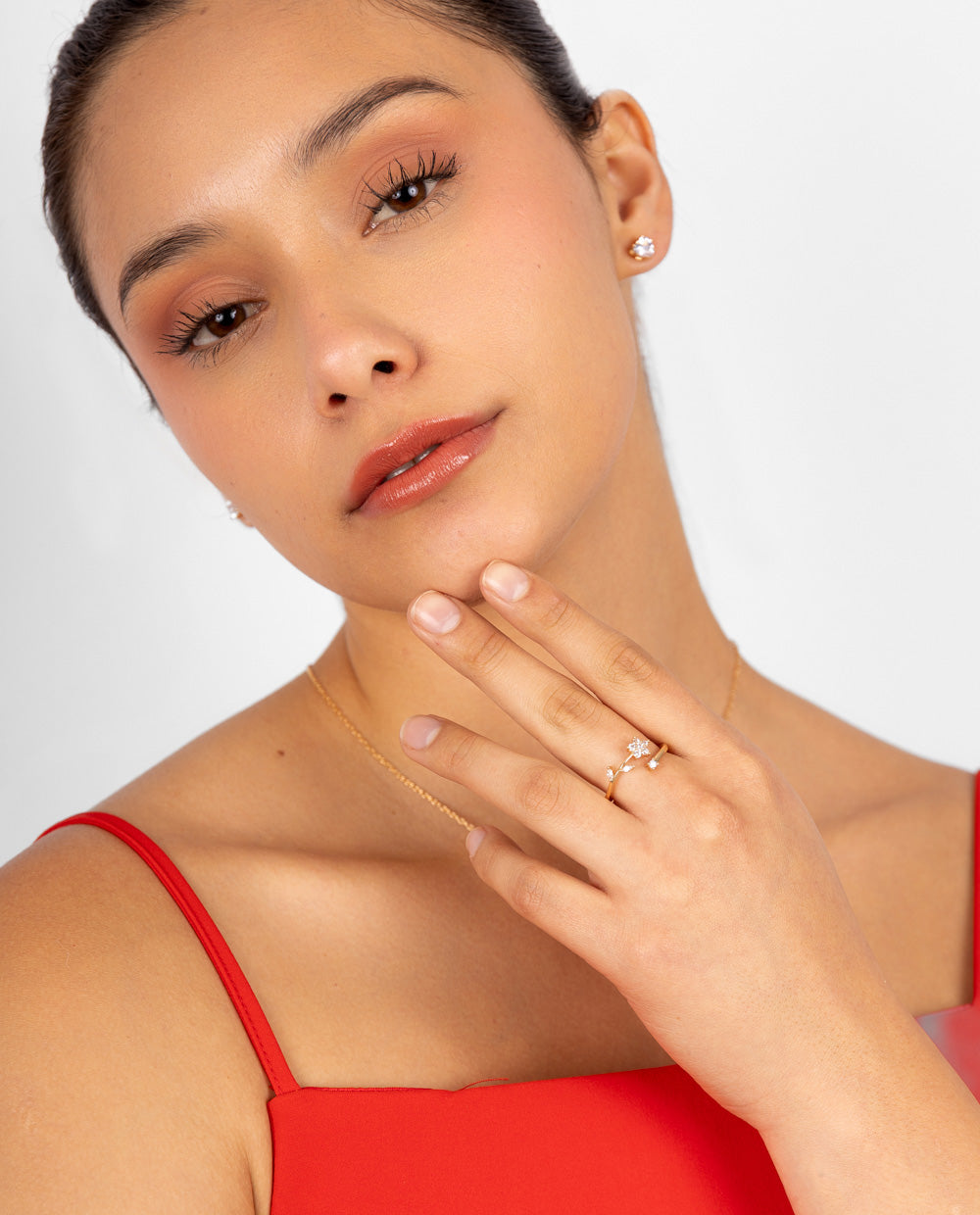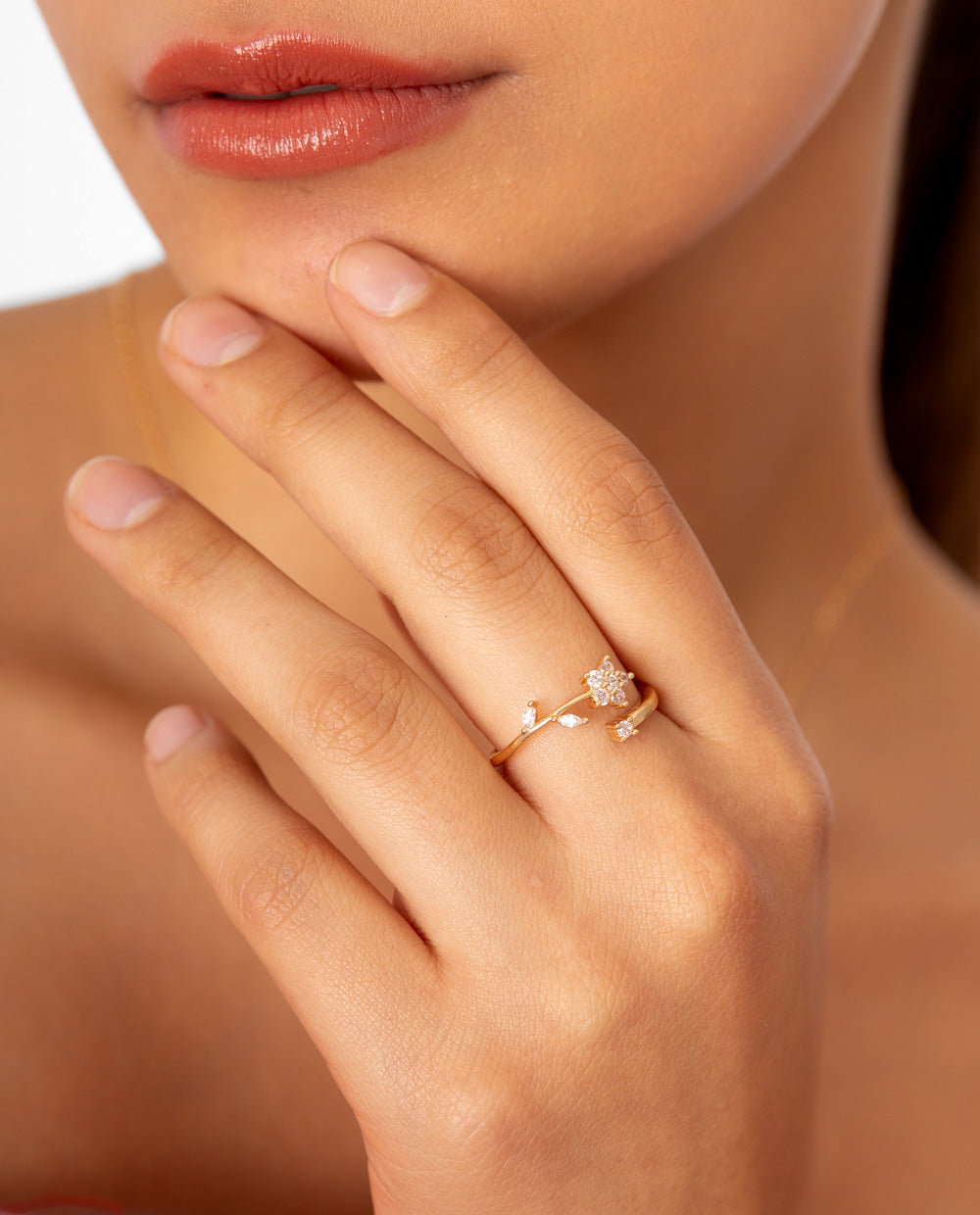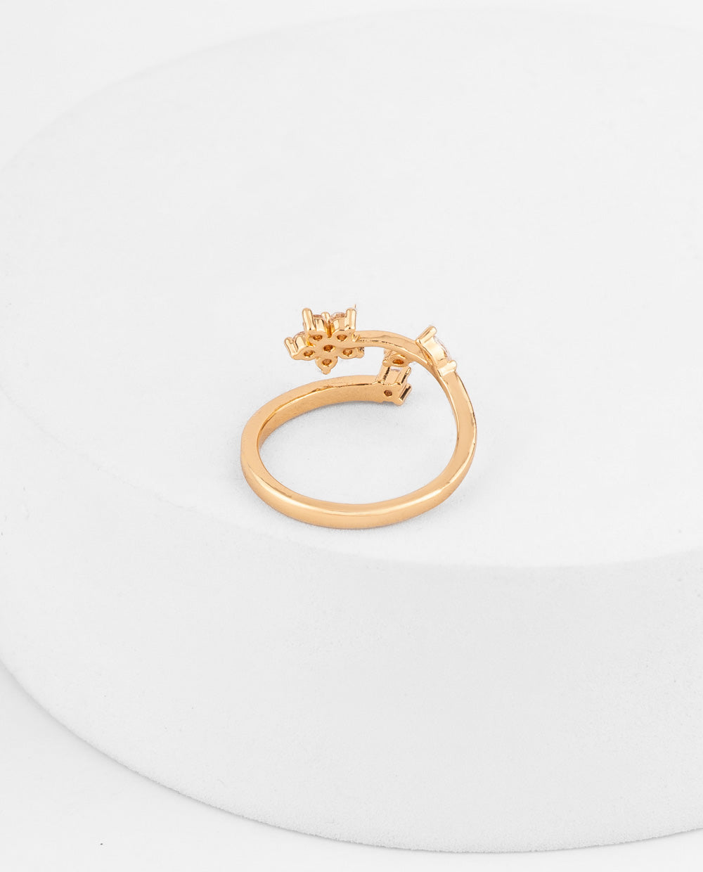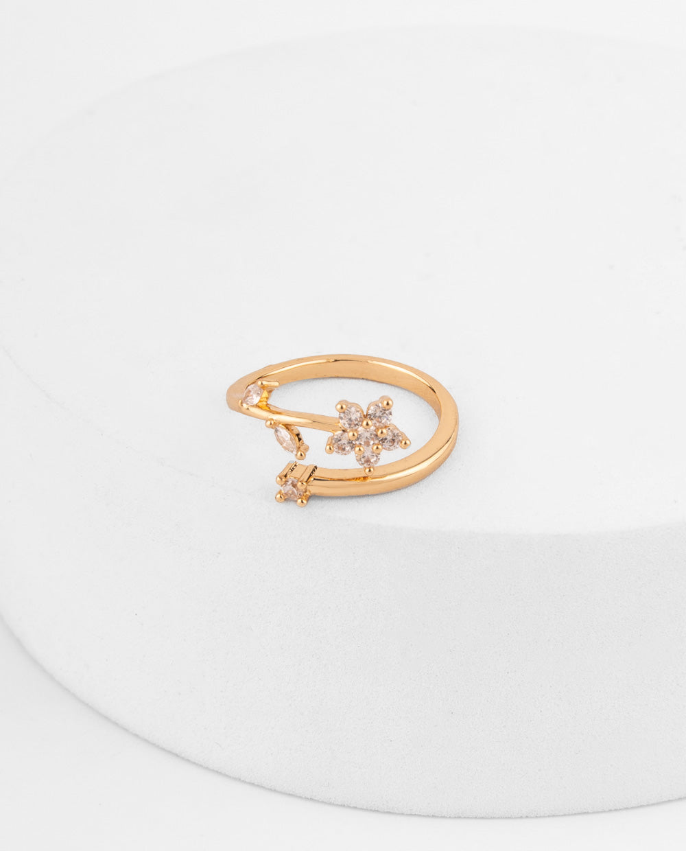 Anillo dorado bañado en oro con diseño floral y detalles de pedrería de zircón que destacan por su brillo intenso y duradero. Su forma abierta permite ajustarlo fácilmente, ofreciendo comodidad y un calce perfecto.