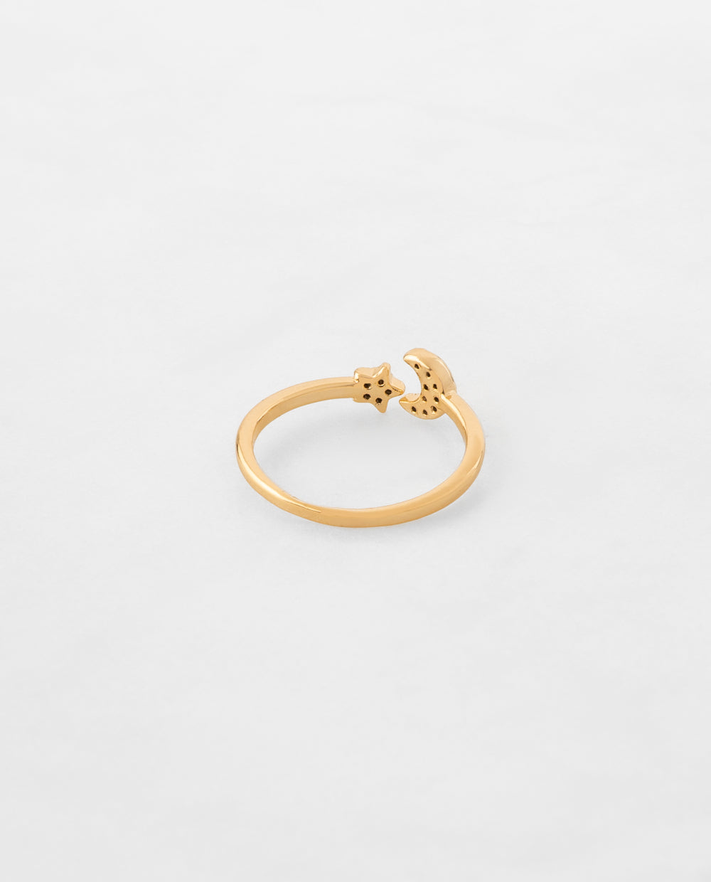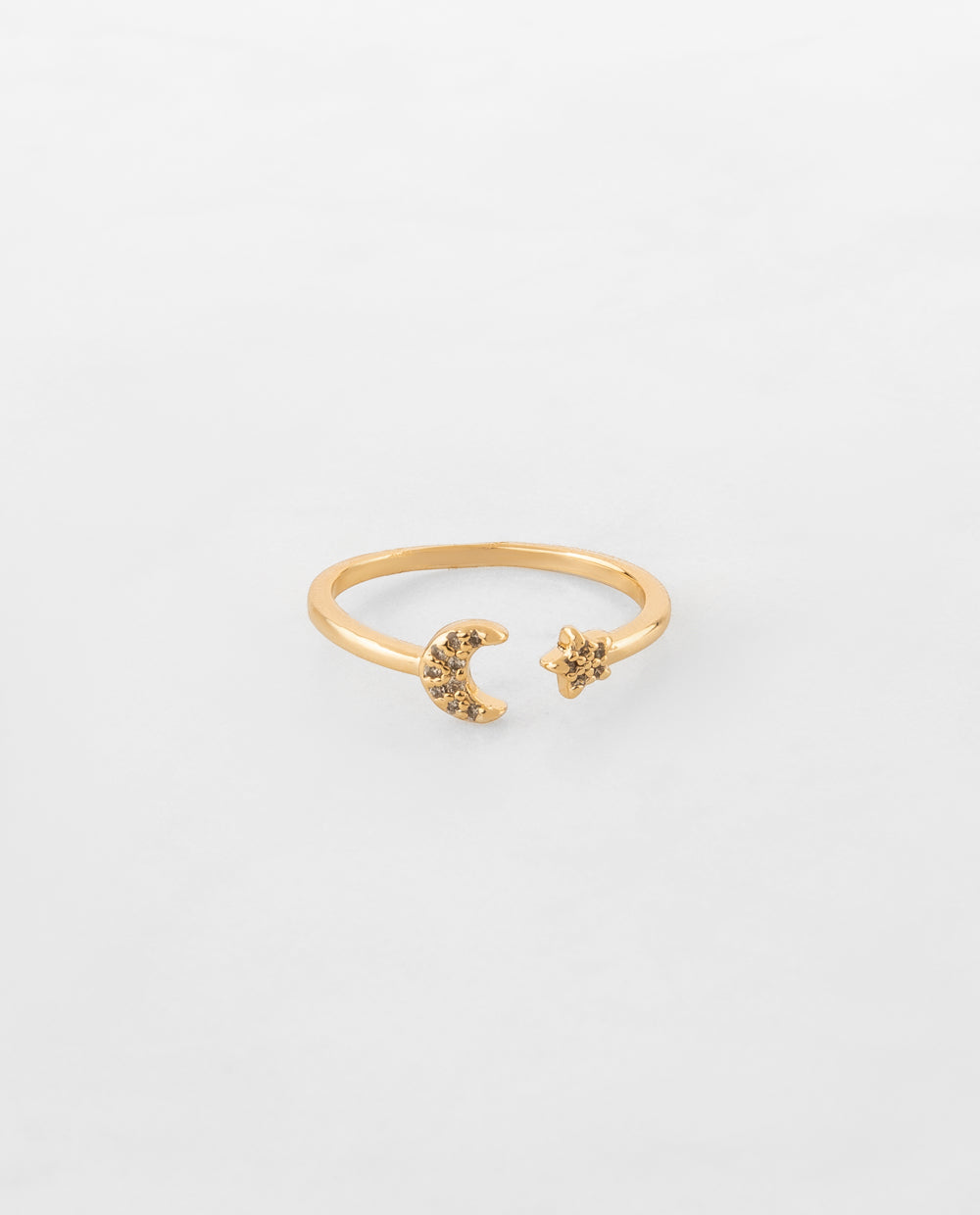 Anillo dorado bañado en oro con diseño abierto de luna y estrella decorados con pedrería de zircón, perfecto para sumar un toque celestial.