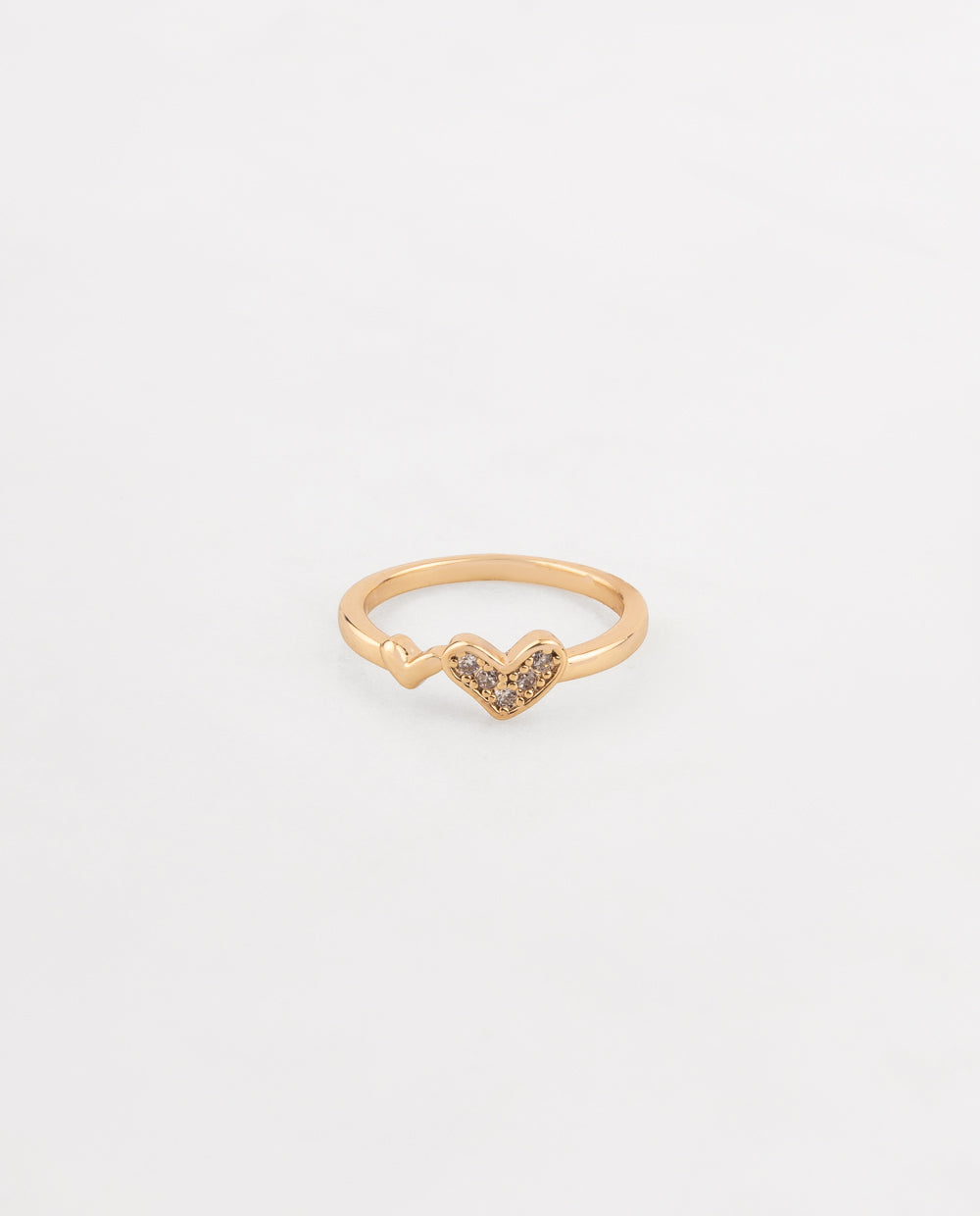 Anillo dorado delicado con diseño de corazón decorado con pedrería de zircón que aporta brillo y romanticismo. Su estilo sutil y elegante lo hace perfecto para usar a diario o en ocasiones especiales. Un accesorio versátil que celebra el amor y tu esencia radiante.