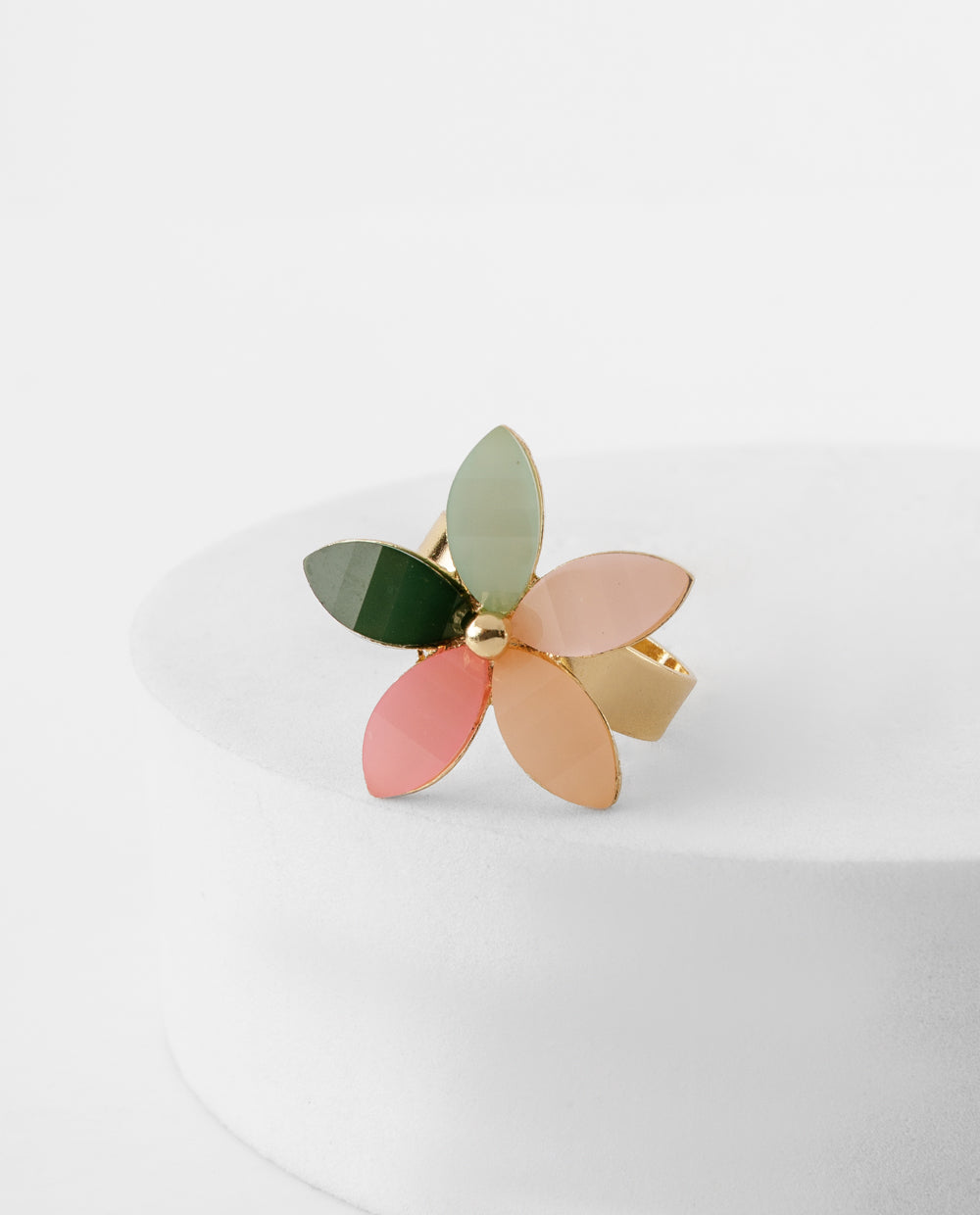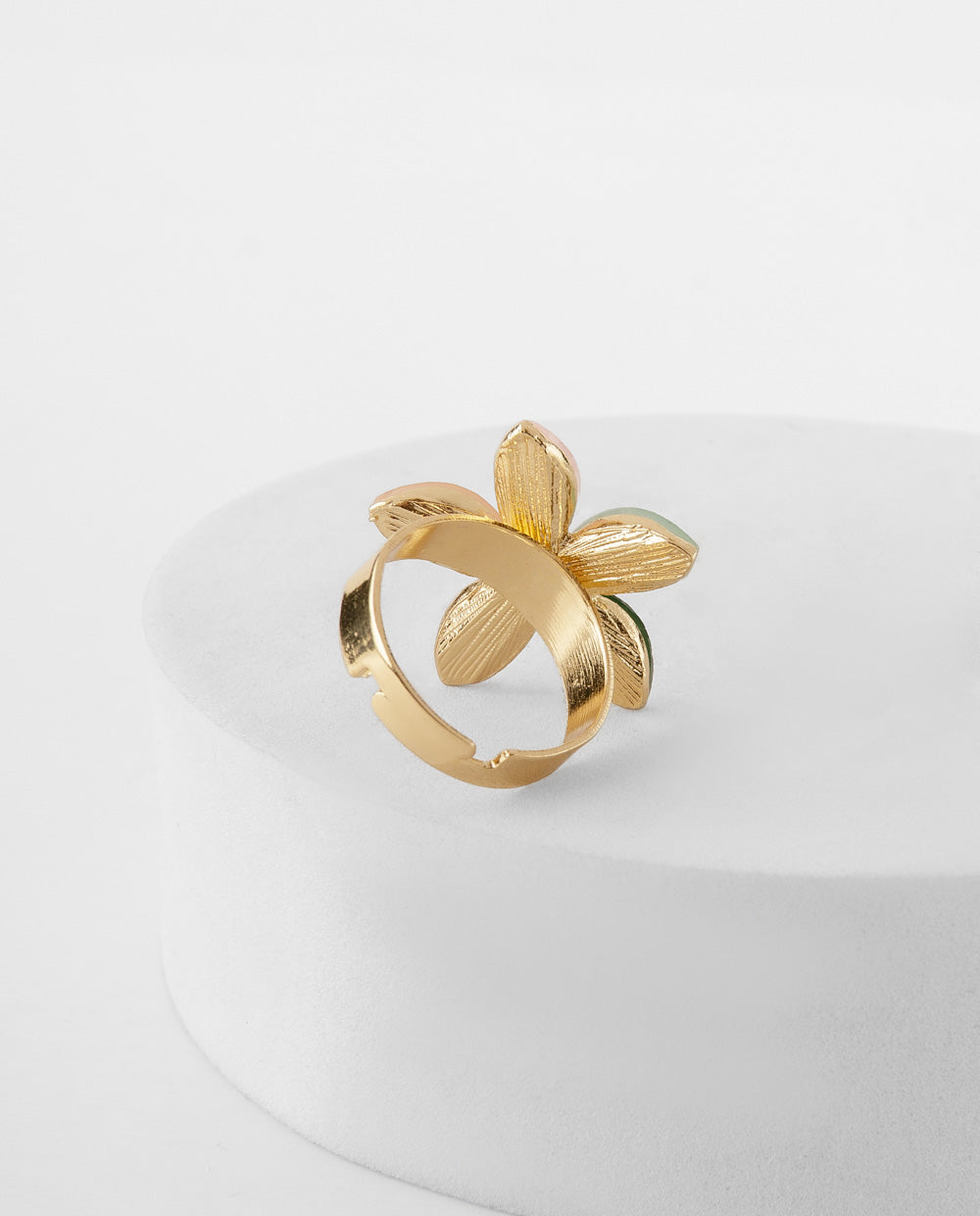 Este anillo dorado en forma de flor combina pétalos en tonos verde, rosado y melocotón que evocan la frescura y alegría de la primavera. Su diseño llamativo y colorido lo convierte en el complemento ideal para realzar looks casuales, vestidos ligeros o estilos boho chic. Un accesorio versátil que añade un toque divertido y vibrante a tu día a día.