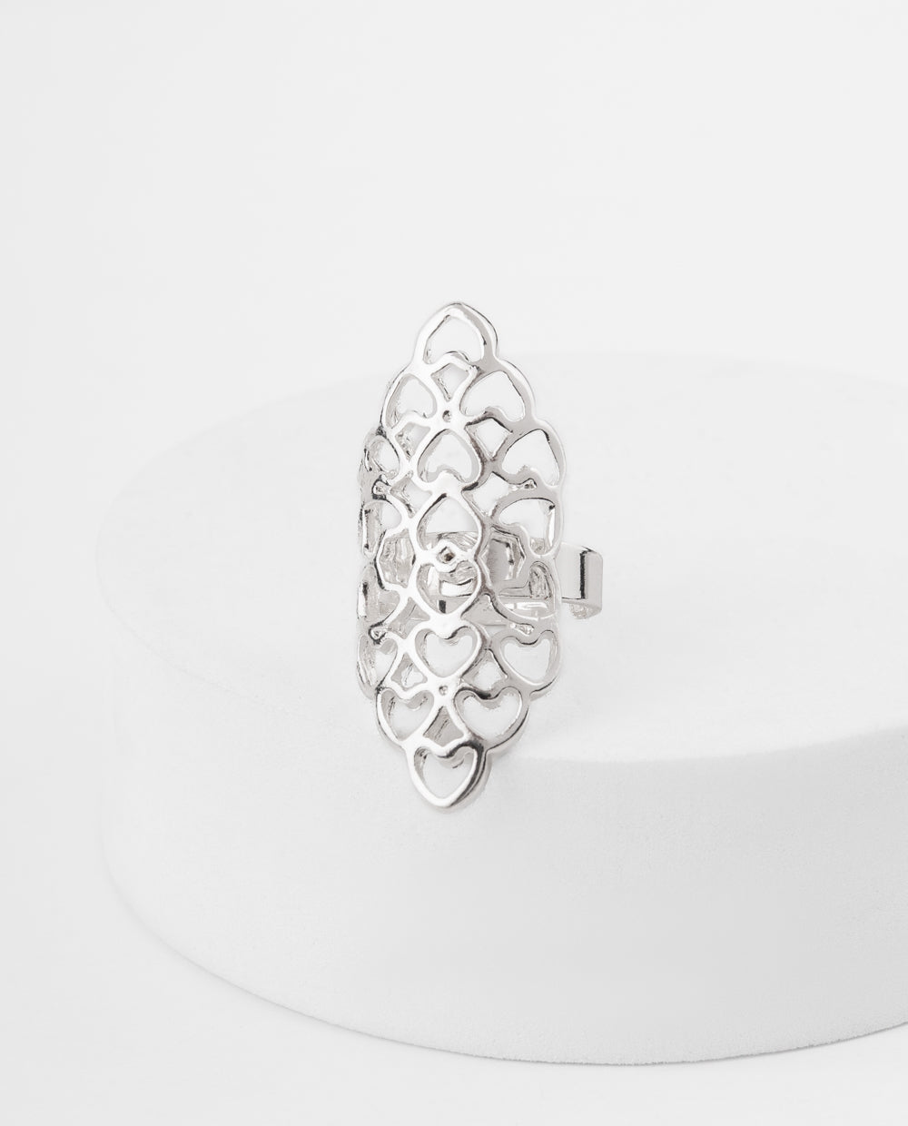 Anillo plateado ajustable con diseño calado de múltiples corazones que crean un estilo romántico y moderno. Su acabado brillante lo convierte en una pieza ideal para usar a diario o destacar en ocasiones especiales. Perfecto para combinar con outfits casuales, looks en denim o dar un toque delicado y elegante a tu estilo.