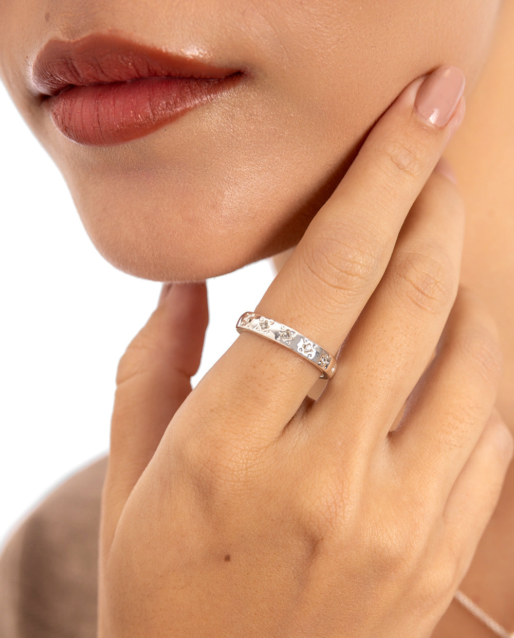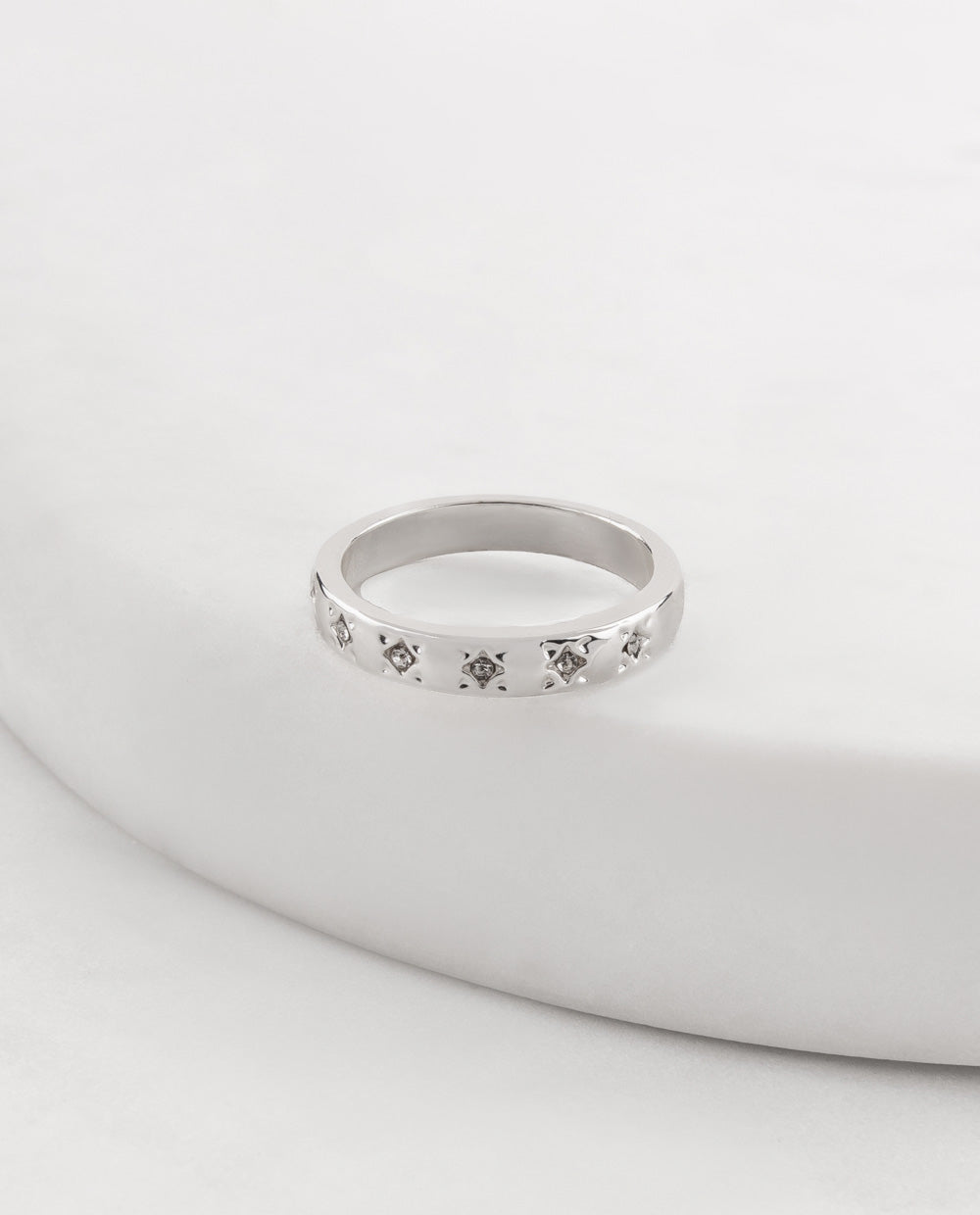 De nuestra colección Premium, este anillo está bañado en plata y elaborado con materiales hipoalergénicos, ideal para pieles sensibles. Su diseño con delicadas estrellas en relieve lo convierte en un accesorio moderno y sofisticado, perfecto para acompañarte en todo momento.