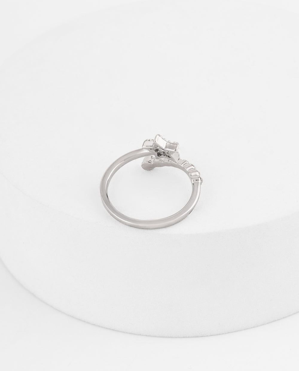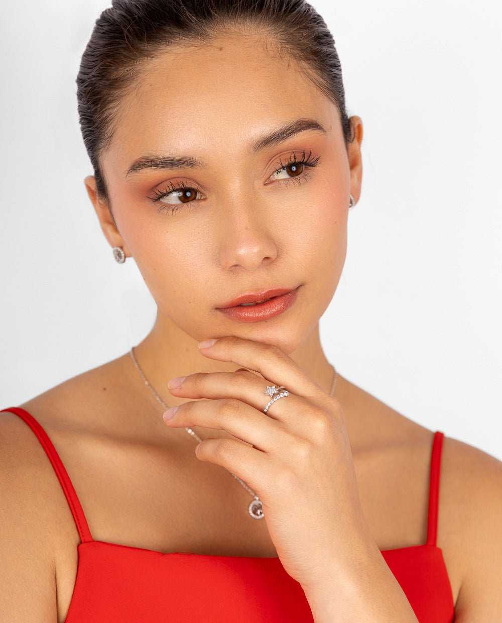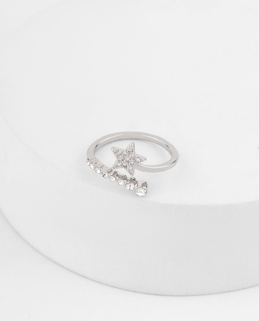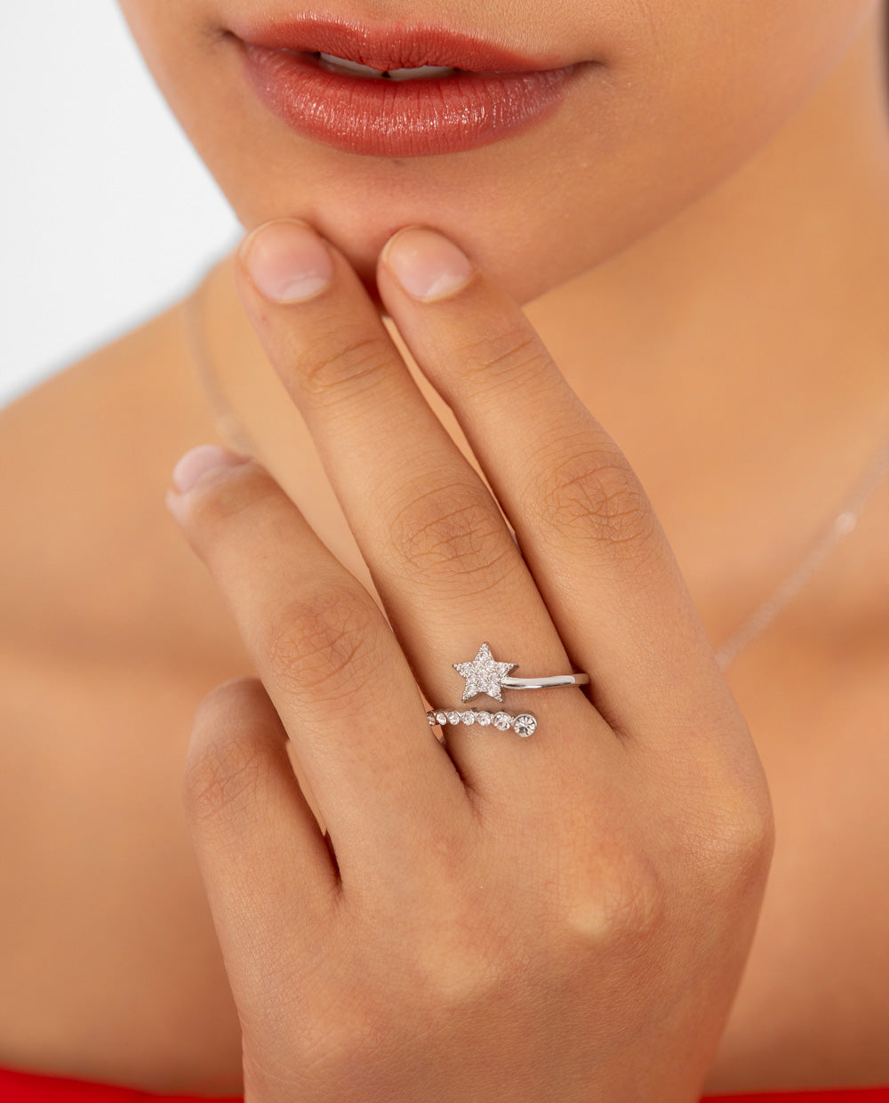 Anillo plateado bañado en plata con diseño de estrella fugaz decorada con pedrería de zircón. Es de un ajuste regulable para un calce cómodo y personalizado