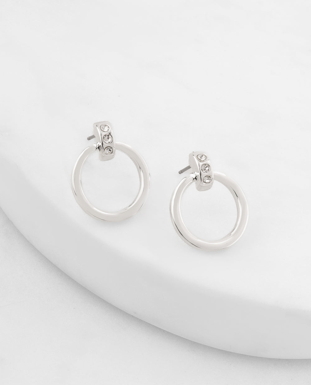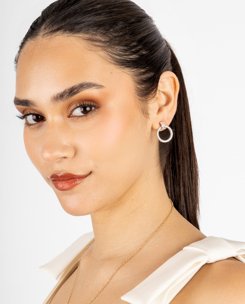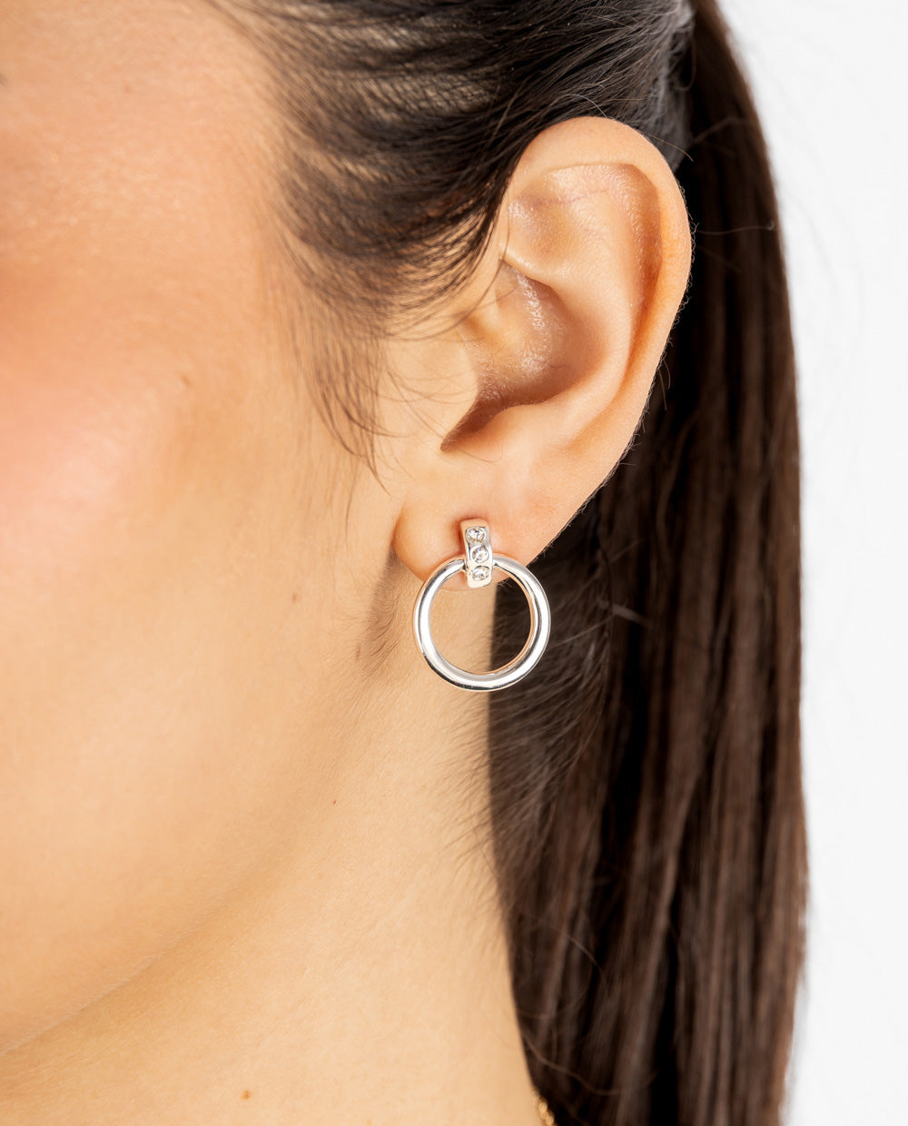 Aretes argolla bañados en plata, con un diseño moderno realzado por incrustaciones de pedrería. Hipoalergénicos perfectos para pieles sensibles.