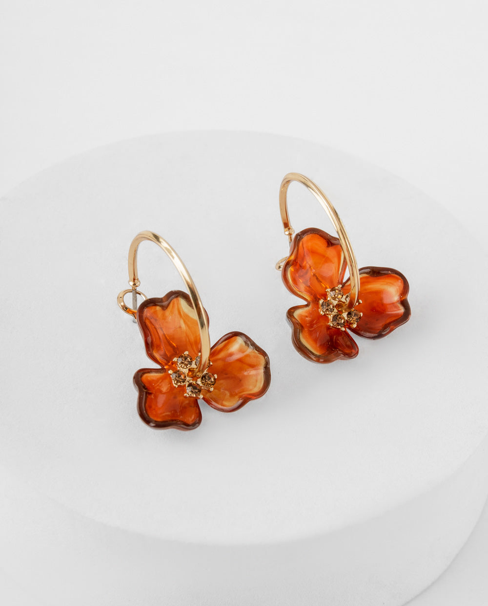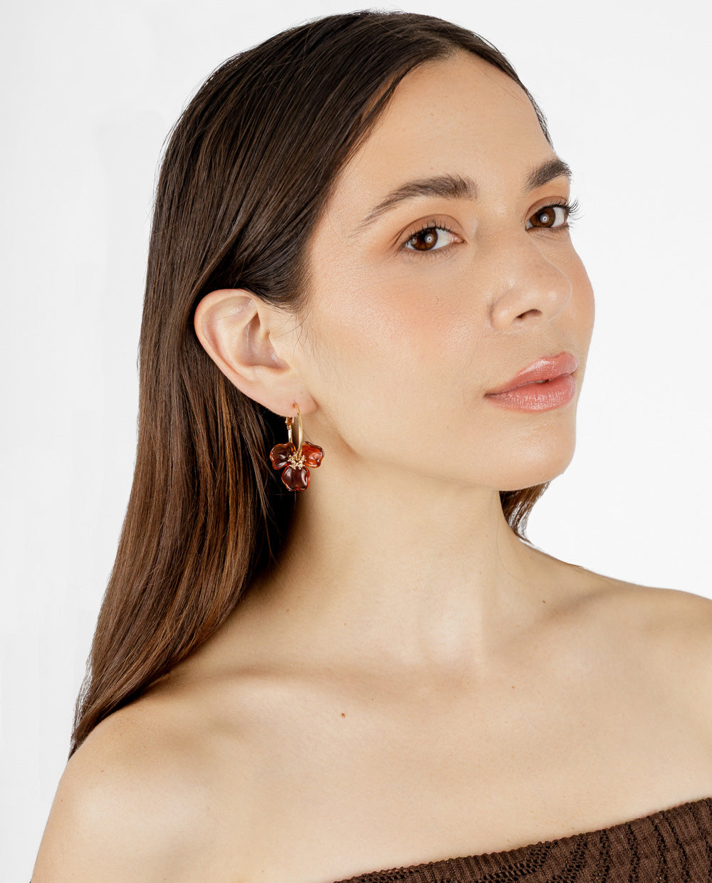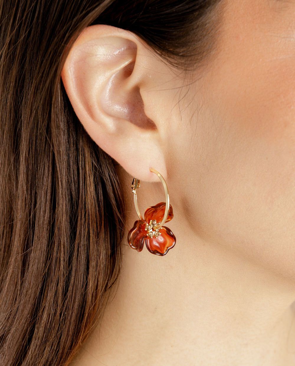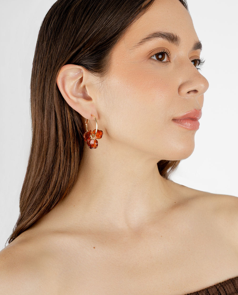 Estos aretes de aro dorado destacan por su flor en tono naranja translúcido con centro brillante, evocando la calidez y vitalidad de la primavera. Su diseño moderno y ligero los convierte en el complemento ideal para vestidos vaporosos, blusas frescas o looks casuales con aire boho chic. Un accesorio vibrante que aporta color y estilo en cada ocasión.