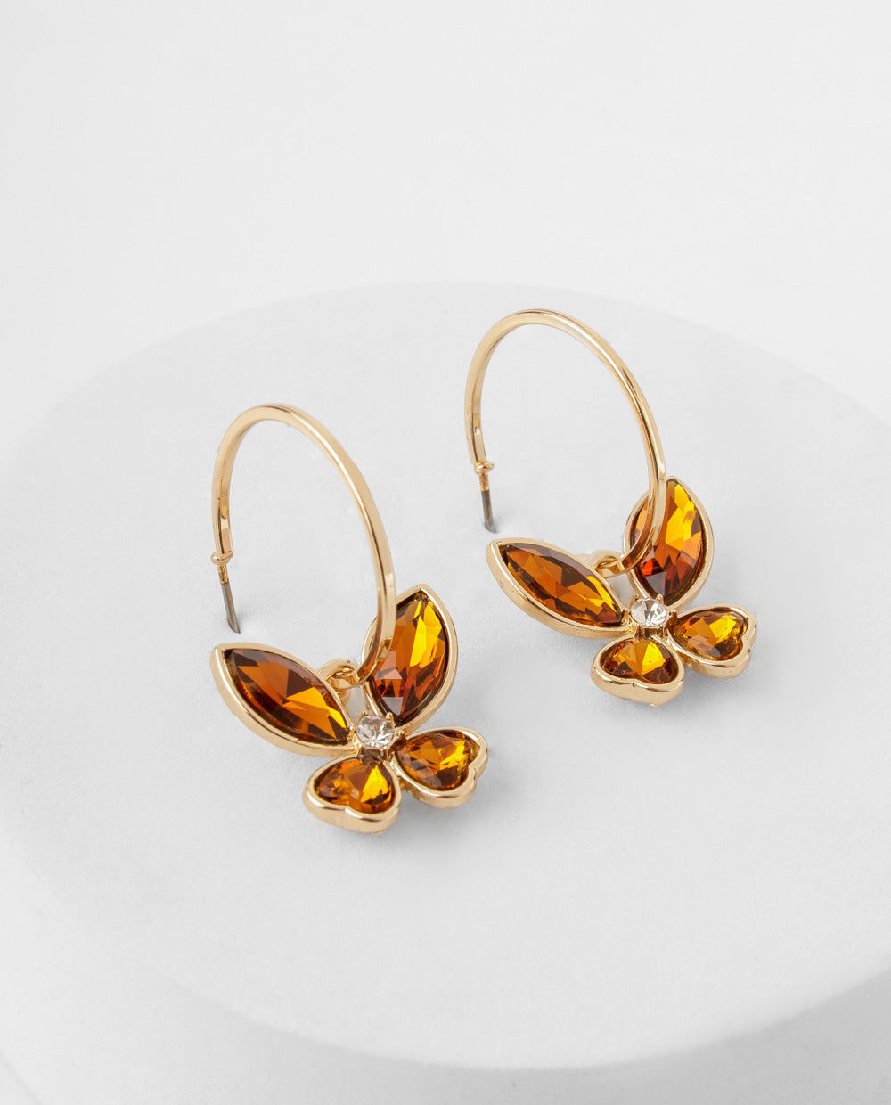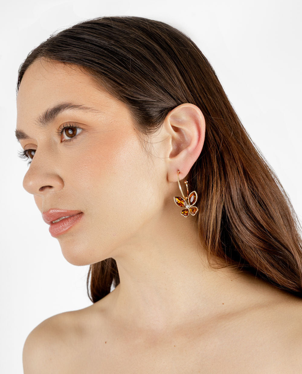 Estos aretes de aro dorado con mariposa en cristales color ámbar aportan un estilo fresco y lleno de vida, ideal para la temporada primaveral. Su diseño ligero y brillante los convierte en el complemento perfecto para vestidos vaporosos, blusas románticas o looks casuales con esencia boho chic. Un accesorio que refleja libertad y elegancia en cada ocasión.