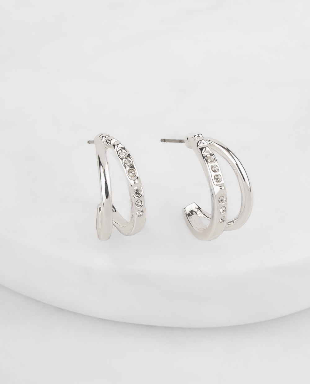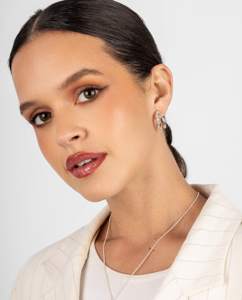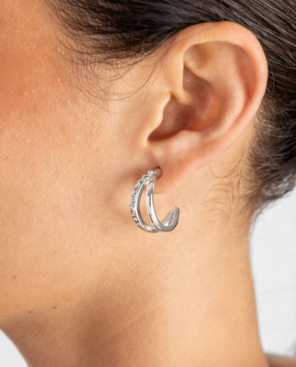 Diseño moderno y sofisticado. Estos aros de la colección Premium combinan el brillo del acabado plateado con una estructura de doble argolla decorada con pedrería. Hipoalergénicos e ideales para pieles sensibles, son el complemento perfecto para elevar tus looks con elegancia y actitud.