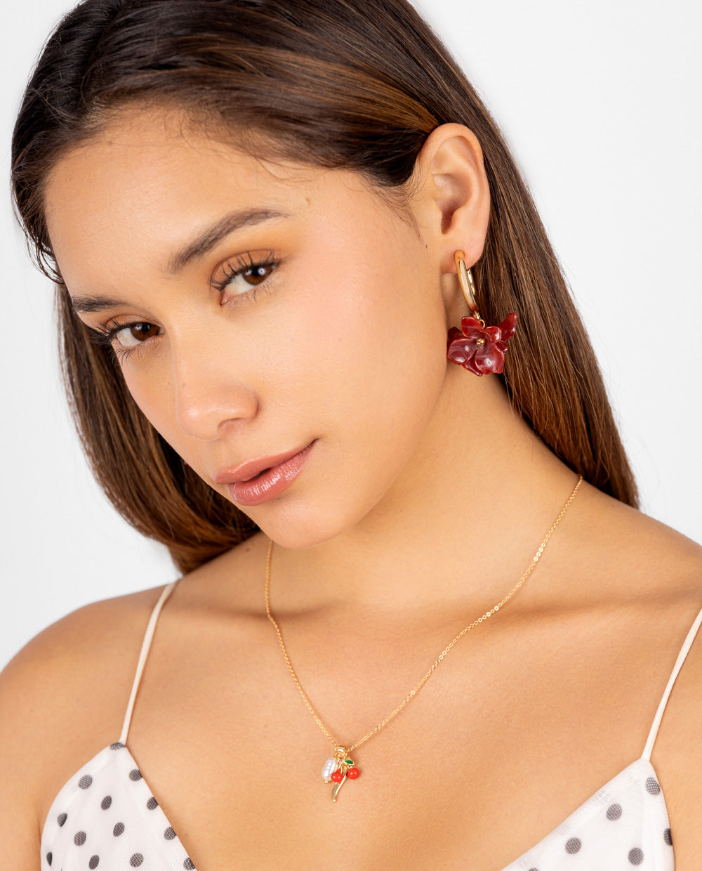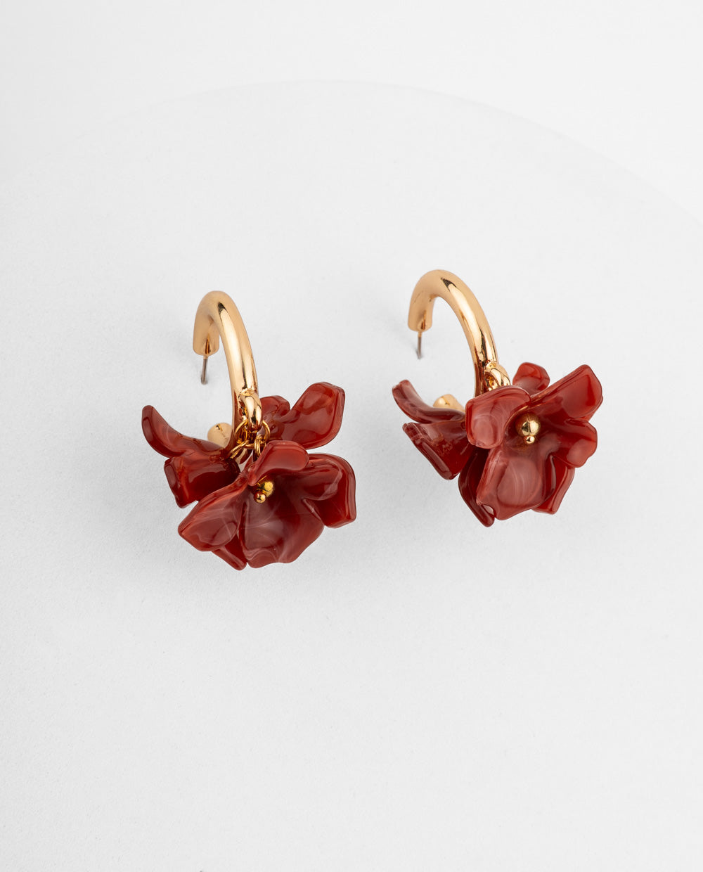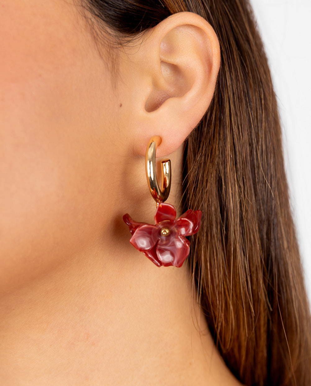 Aretes argolla en acabado dorado con apliques de flor en tono rojo cábala. Su diseño voluminoso y femenino aporta un toque audaz y elegante al rostro. Ideales para combinar con peinados recogidos o looks neutros que resalten su brillo y color.