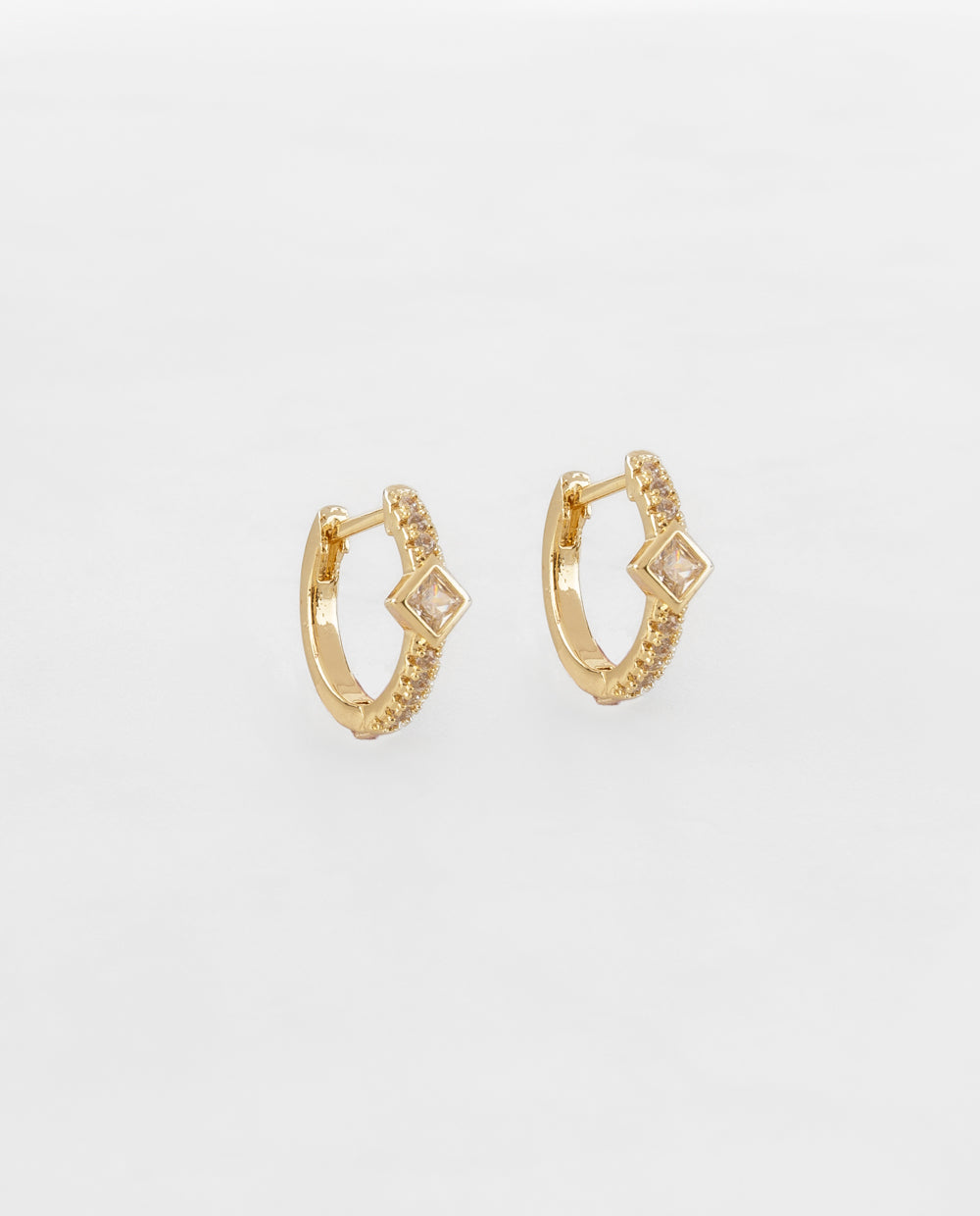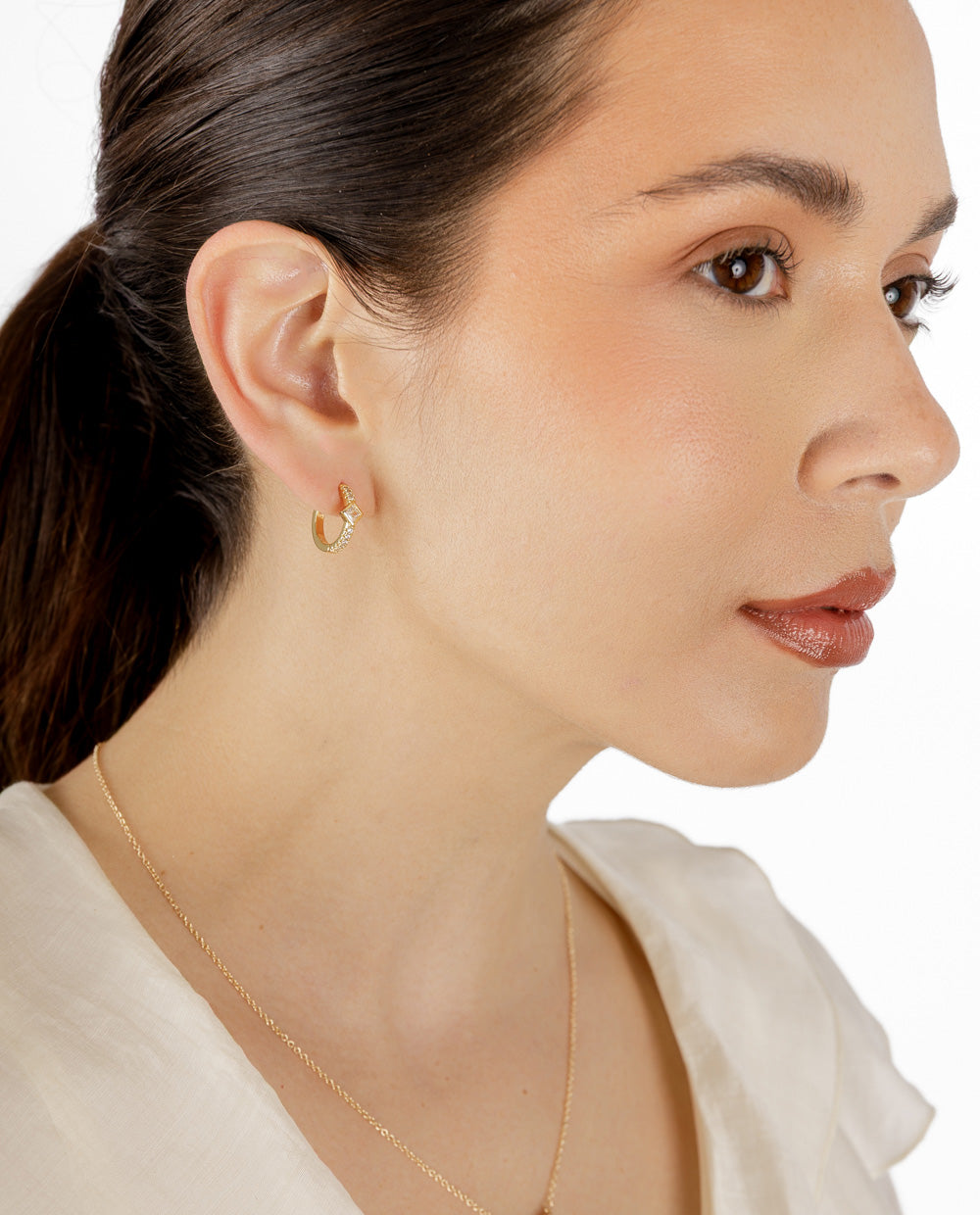 Estos aretes de aro bañados en oro cuentan con delicados zircones incrustados y un detalle central geométrico que resalta su brillo sofisticado. Su diseño versátil los convierte en el accesorio ideal para looks primaverales, desde outfits casuales hasta combinaciones más elegantes. Una pieza de la colección Glow que refleja frescura y un estilo boho chic lleno de luz.