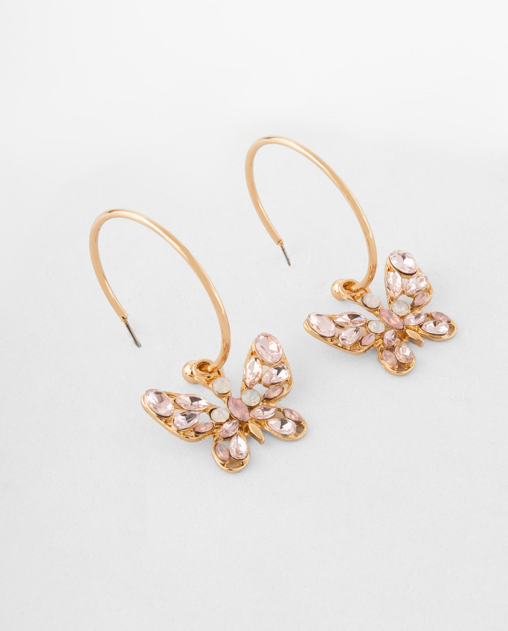 Aretes argollas en forma de mariposa con acabado nacarado y gancho circular delgado.
