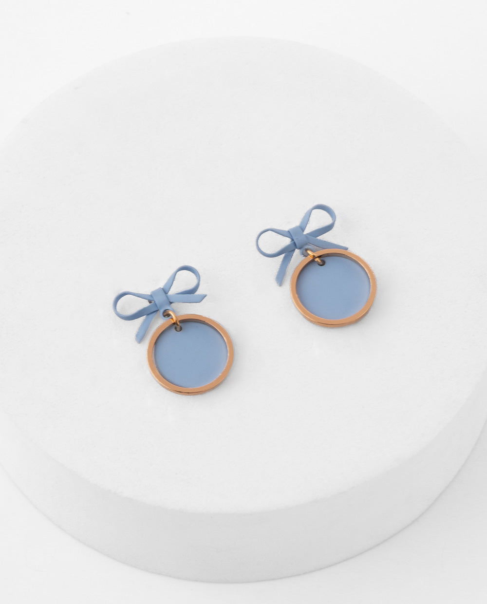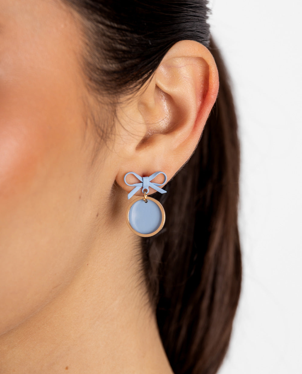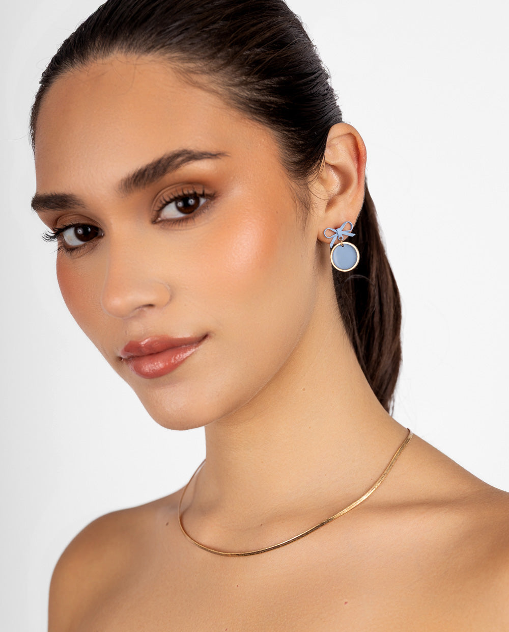 Aretes colgantes con detalle de lazo celeste y aro dorado, un diseño fresco y femenino que refleja la esencia de la temporada. Su contraste de tonos los convierte en el complemento ideal para looks en denim, aportando un aire juvenil y chic. Perfectos para destacar en un outfit casual de día o sumar un detalle trendy en la noche.