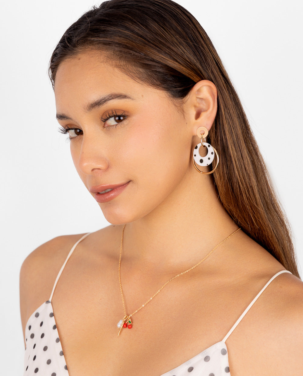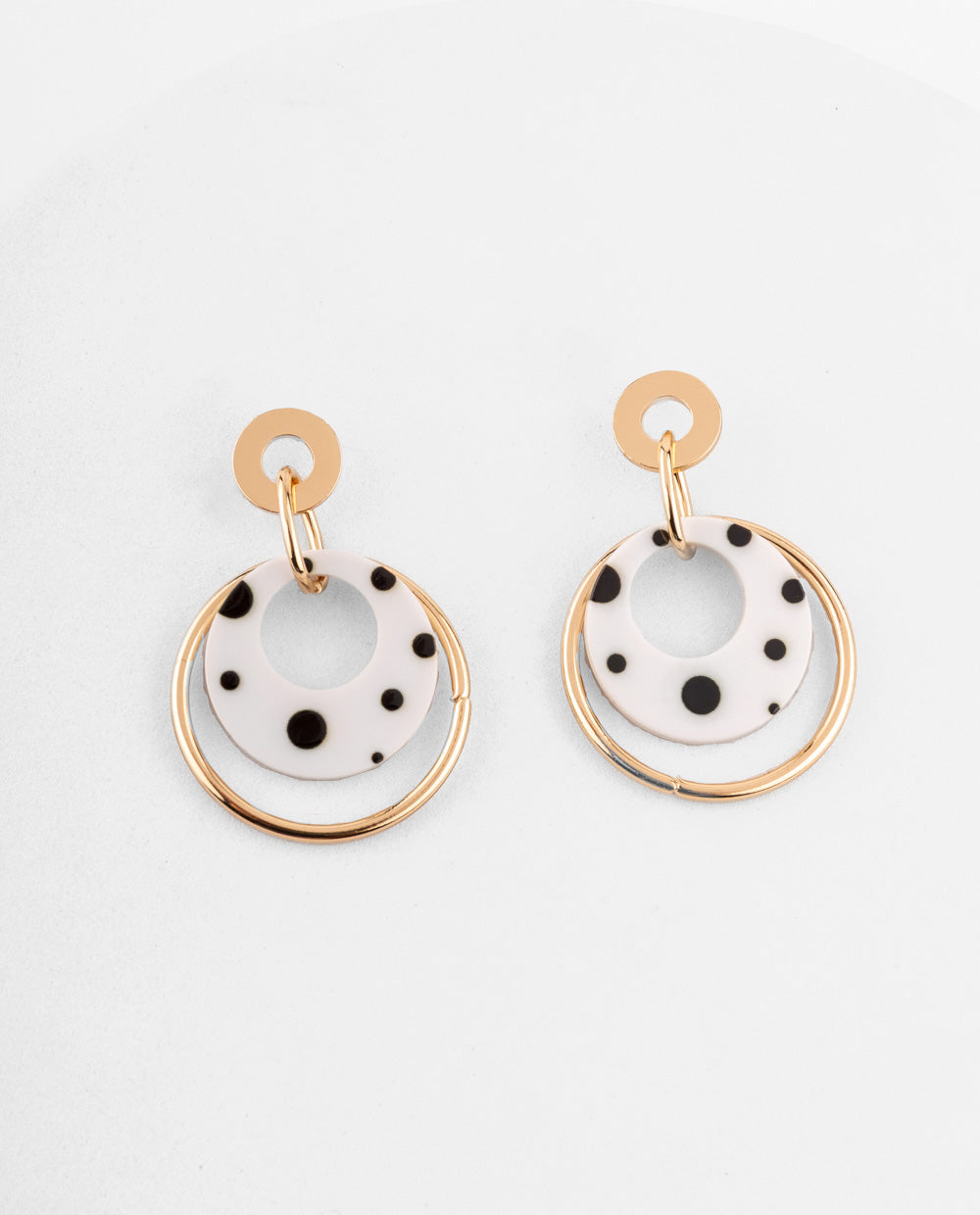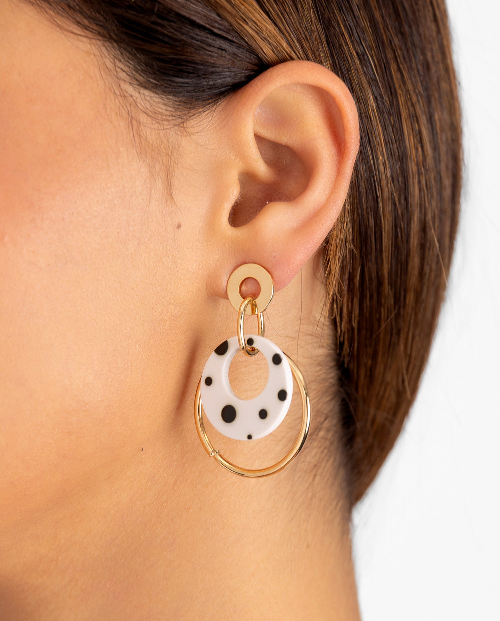 Aretes colgantes con aros dorados y piezas acrílicas blancas con diseño de lunares negros. Su estructura ligera y contraste bicolor crean un look moderno y divertido.