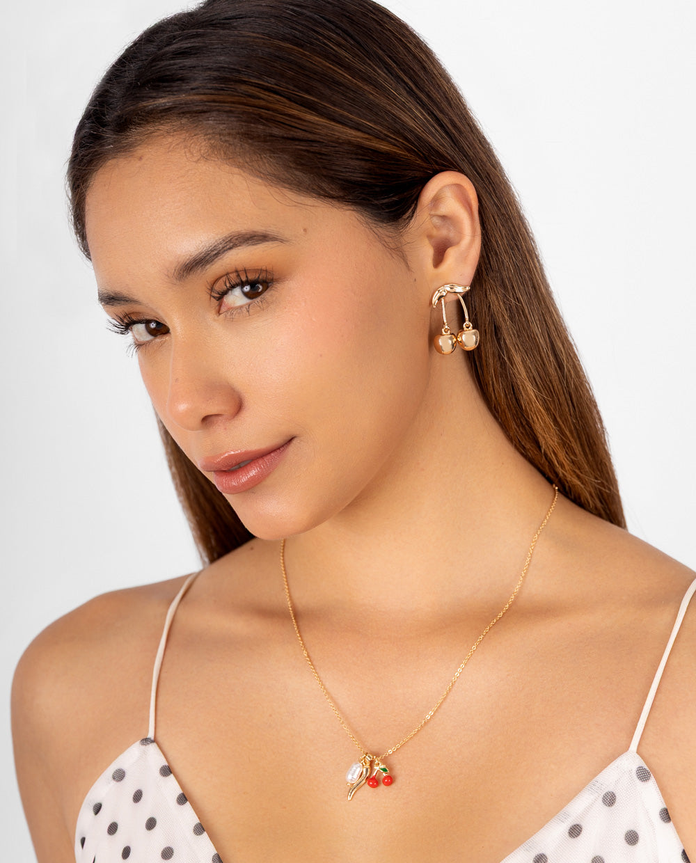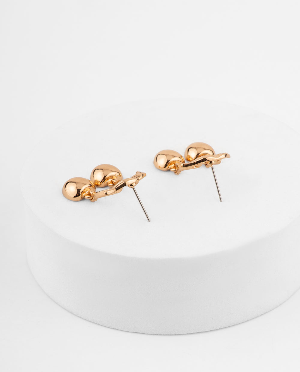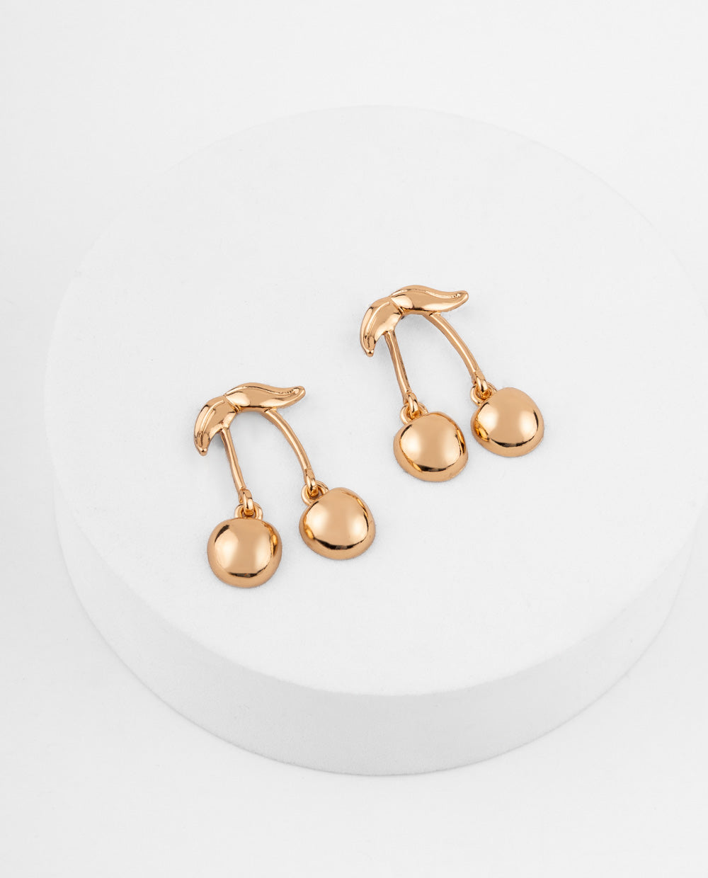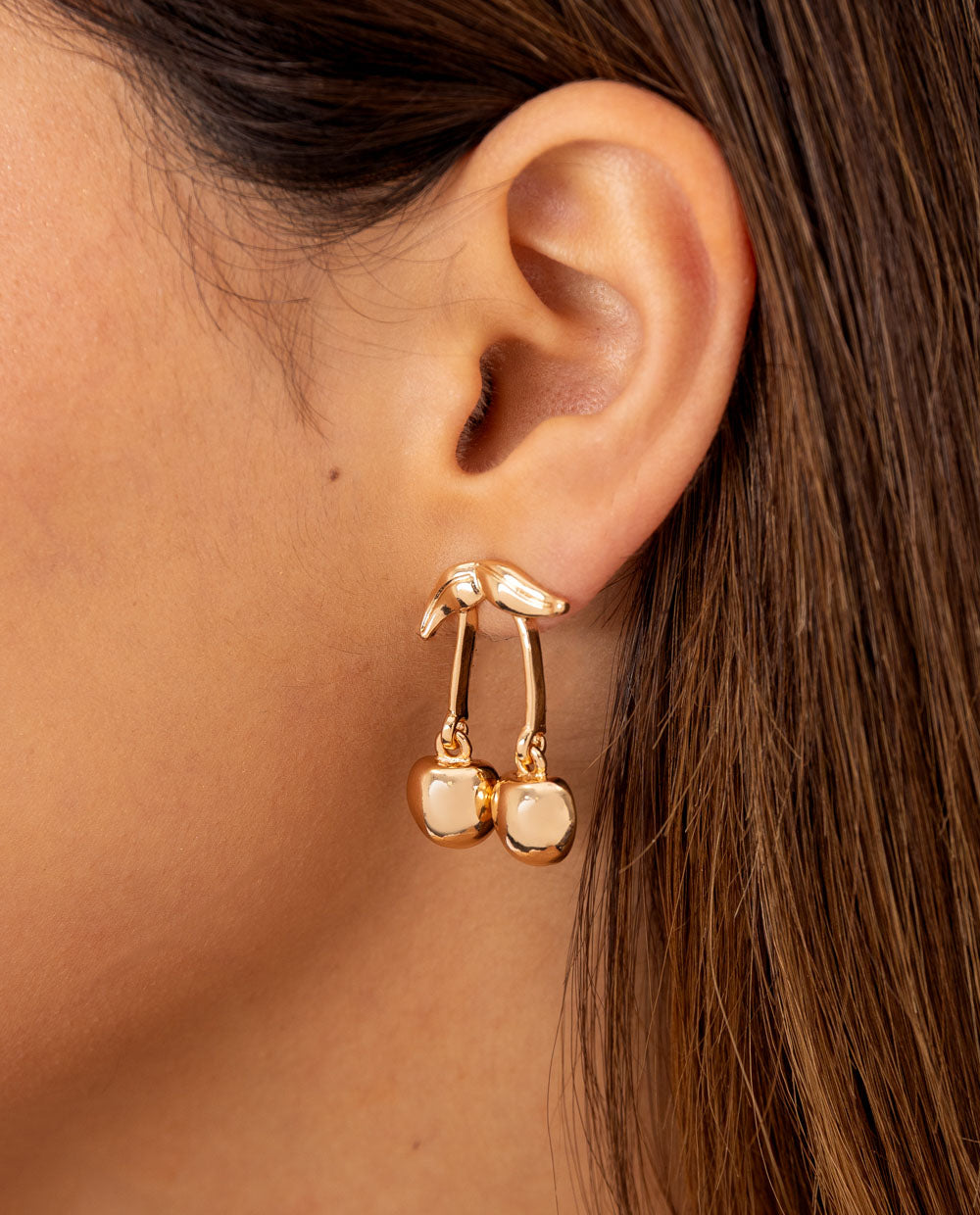 Aretes colgantes con diseño de cerezas dobles en acabado dorado pulido. Elaborados en metal liviano con superficie brillante y estructura simétrica de estilo moderno.