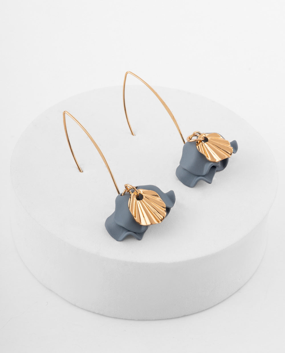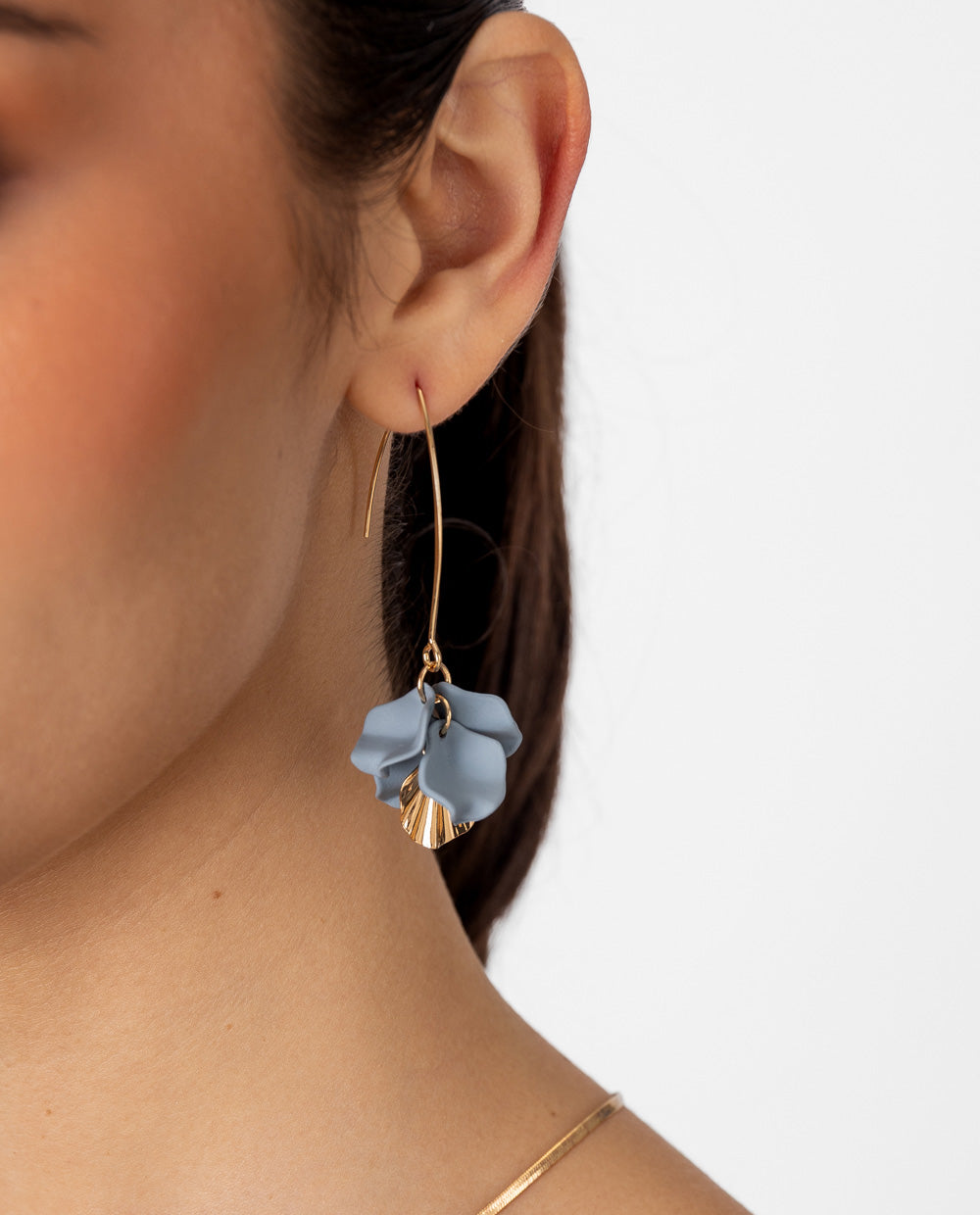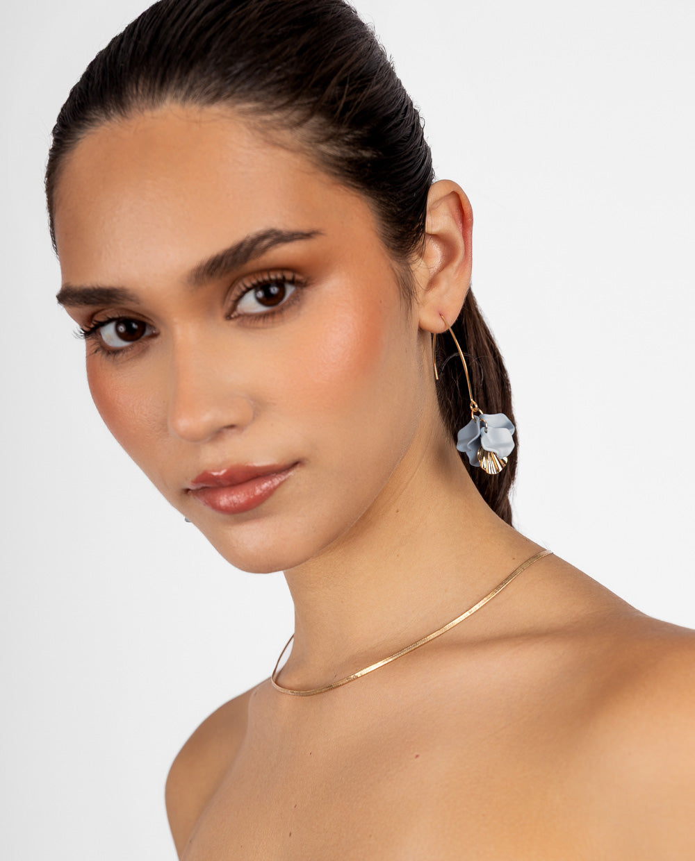 Aretes colgantes con delicadas flores celestes en acabado mate y dije dorado en forma de concha, que evocan frescura y estilo natural. Su diseño único los convierte en el complemento ideal para realzar outfits en denim, aportando un aire moderno y chic. Perfectos para dar un toque trendy a tus looks casuales de temporada.