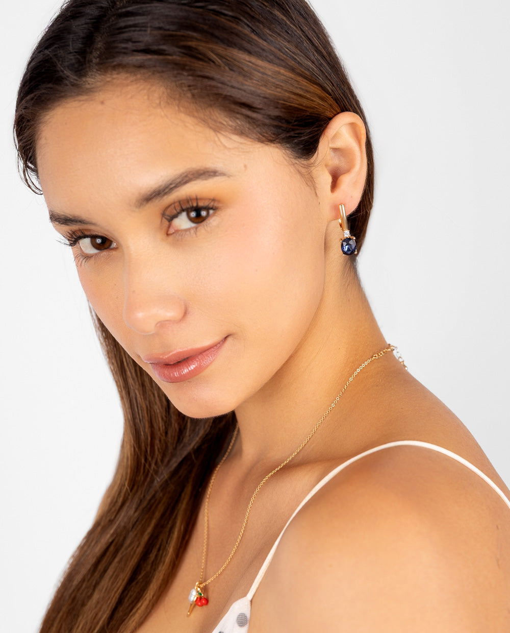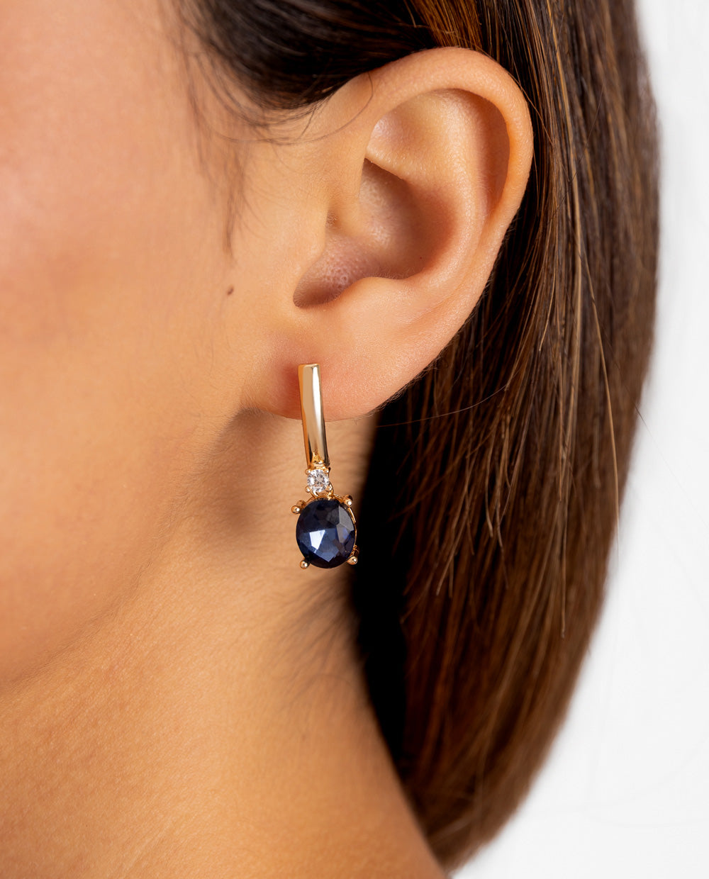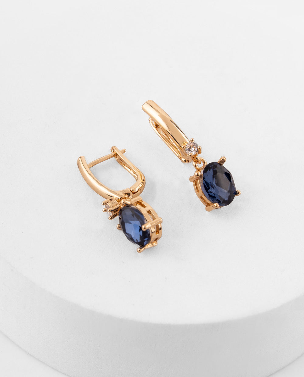 Aretes colgantes en acabado dorado con piedra oval azul y detalle superior brillante. Su diseño elegante y alargado estiliza el rostro y aporta un toque sofisticado.