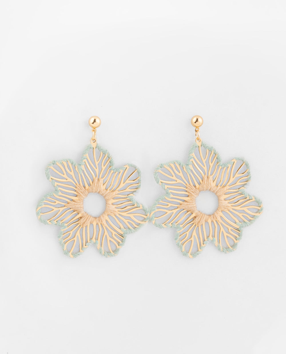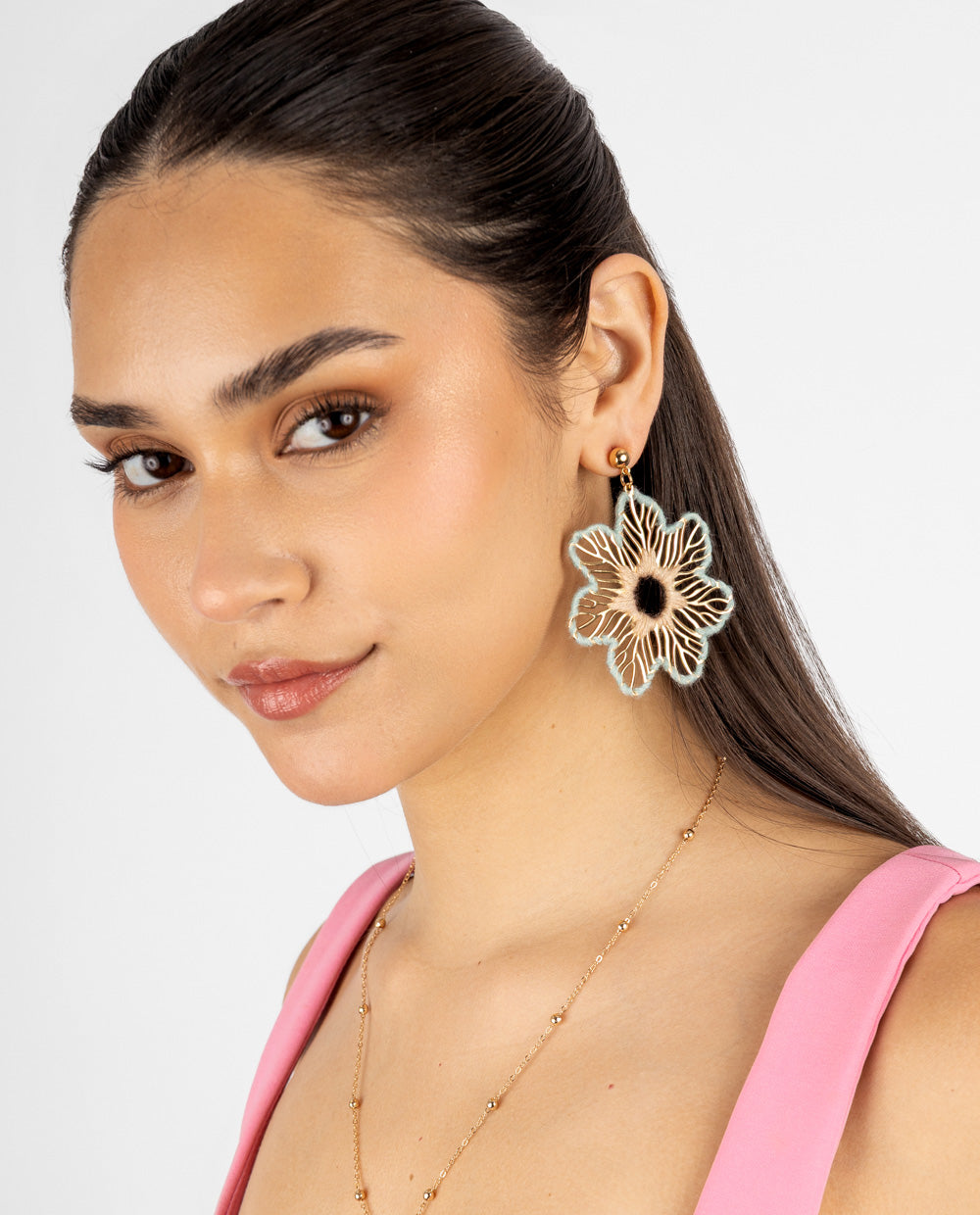 Estos aretes en forma de flor calada combinan tonos pastel suaves con detalles dorados que iluminan cualquier look.