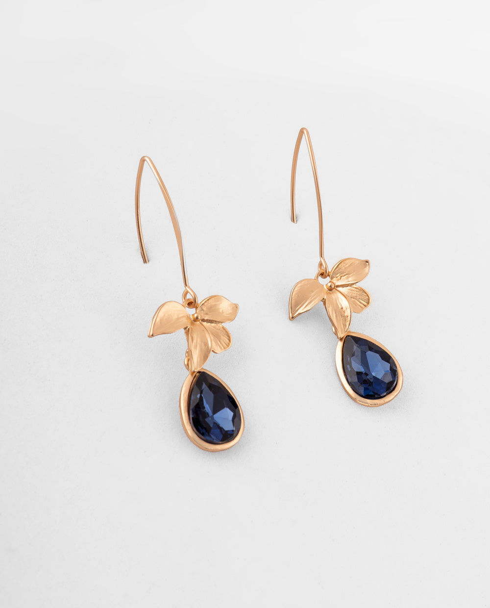 Aretes colgantes en acabado dorado con detalle de flor metálica y piedra facetada en tono azul profundo. Su estructura alargada y brillante combina textura floral con reflejos cristalinos.