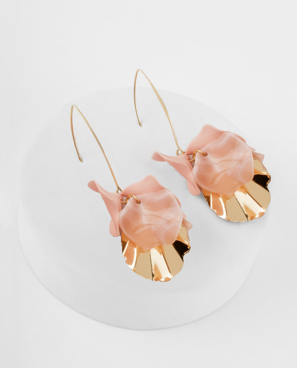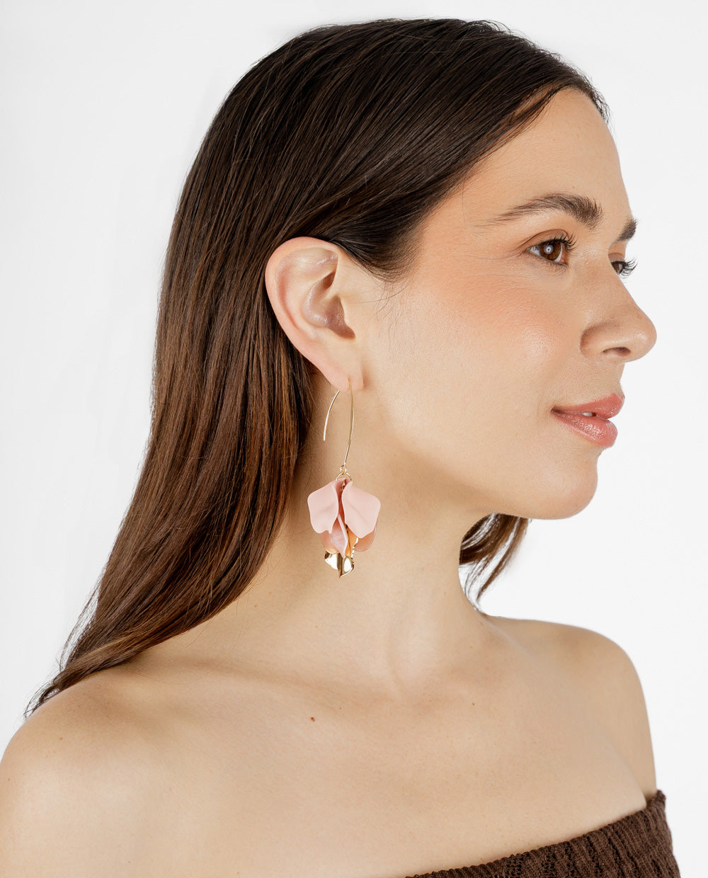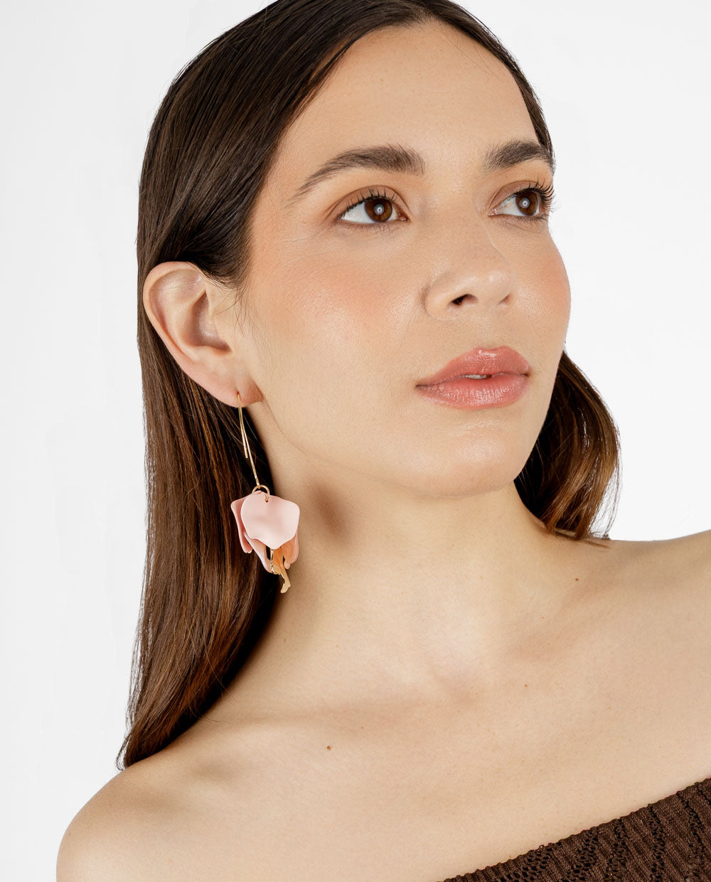 Estos aretes colgantes combinan pétalos en tono rosa suave con detalles dorados que evocan la frescura y feminidad de la primavera. Su diseño ligero y elegante es perfecto para complementar vestidos vaporosos, blusas románticas o looks casuales con aire boho chic. Un accesorio versátil que aporta movimiento, brillo y un toque romántico a tu estilo.