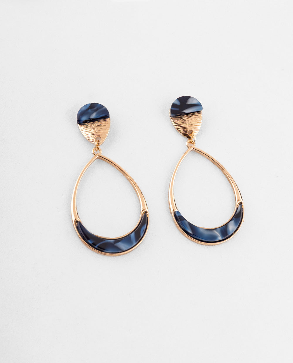 Aretes colgantes en forma de lágrima con base dorada texturizada y detalles en acrílico marmolado azul. Su estructura ligera combina brillo metálico con efecto translúcido para un acabado elegante.