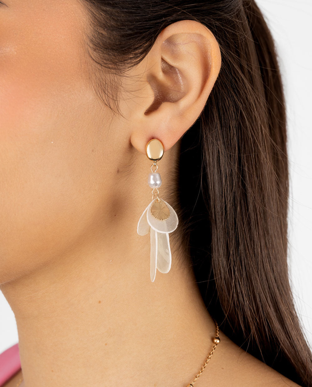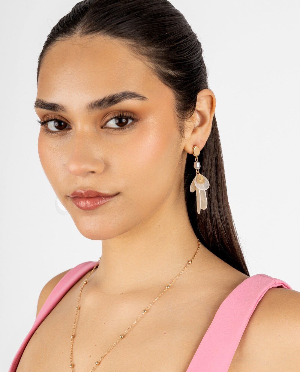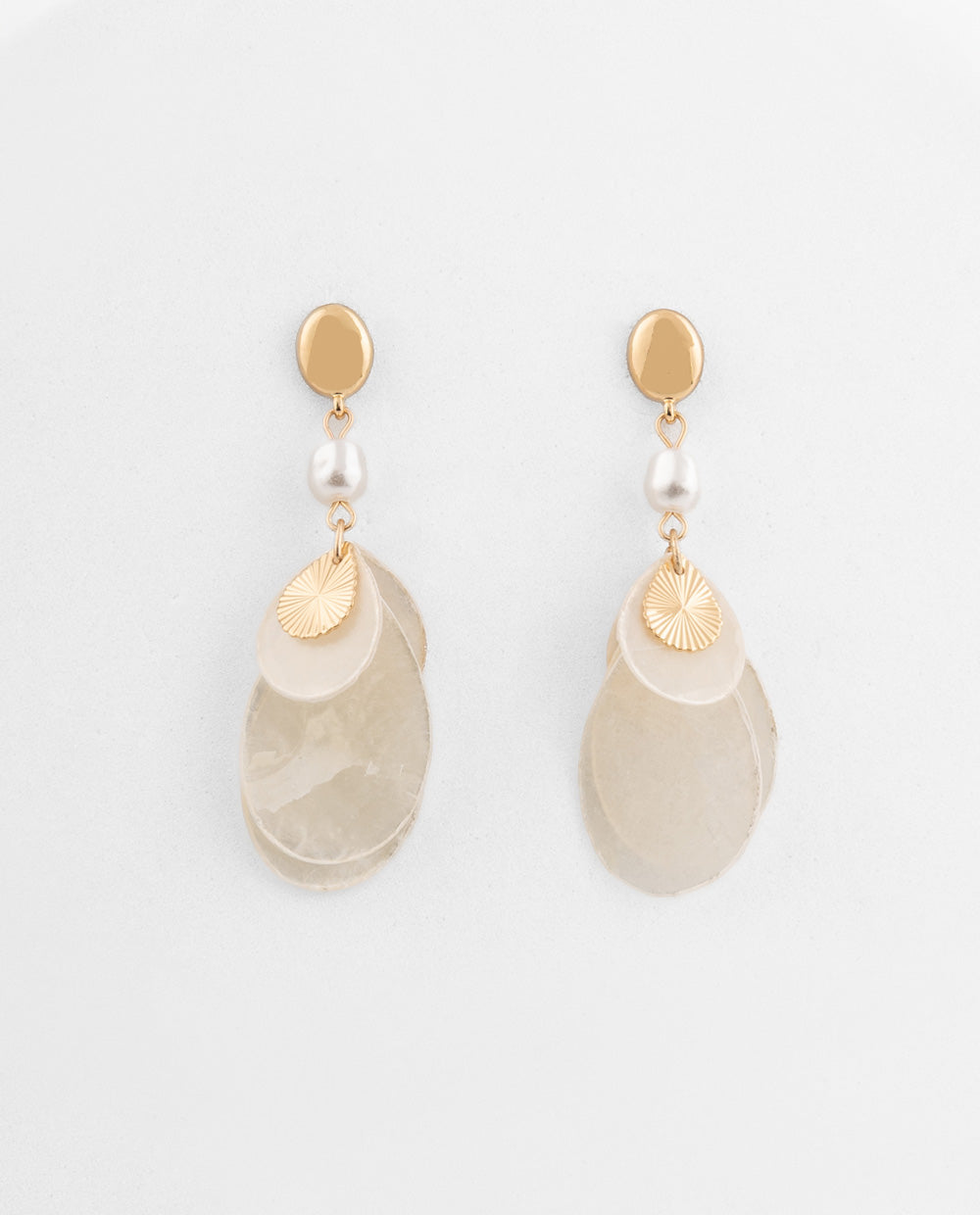 Aretes colgantes con perla, lámina tipo nácar y detalle dorado texturado, perfectos para un look elegante y suave.