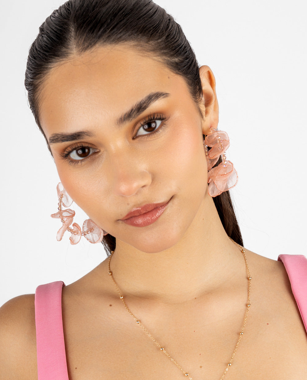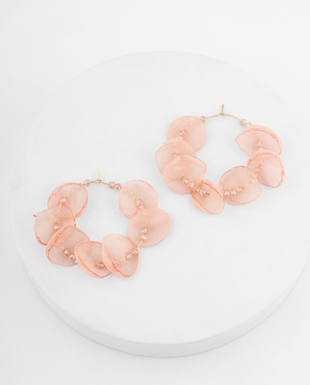 Aretes circulares con pétalos de tela translúcida en tono rosa y cuentas decorativas que aportan movimiento y un acabado delicado y femenino.