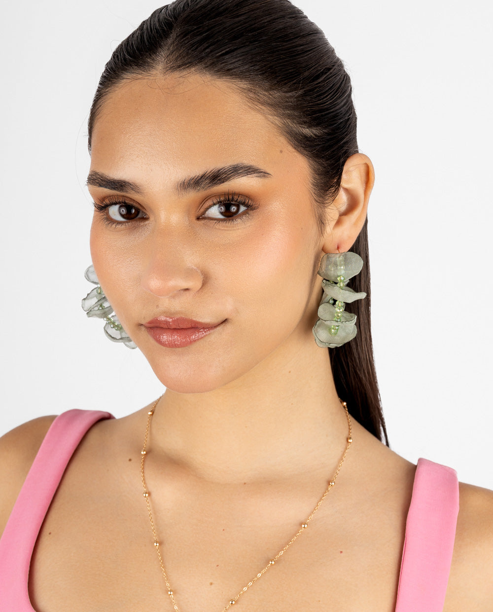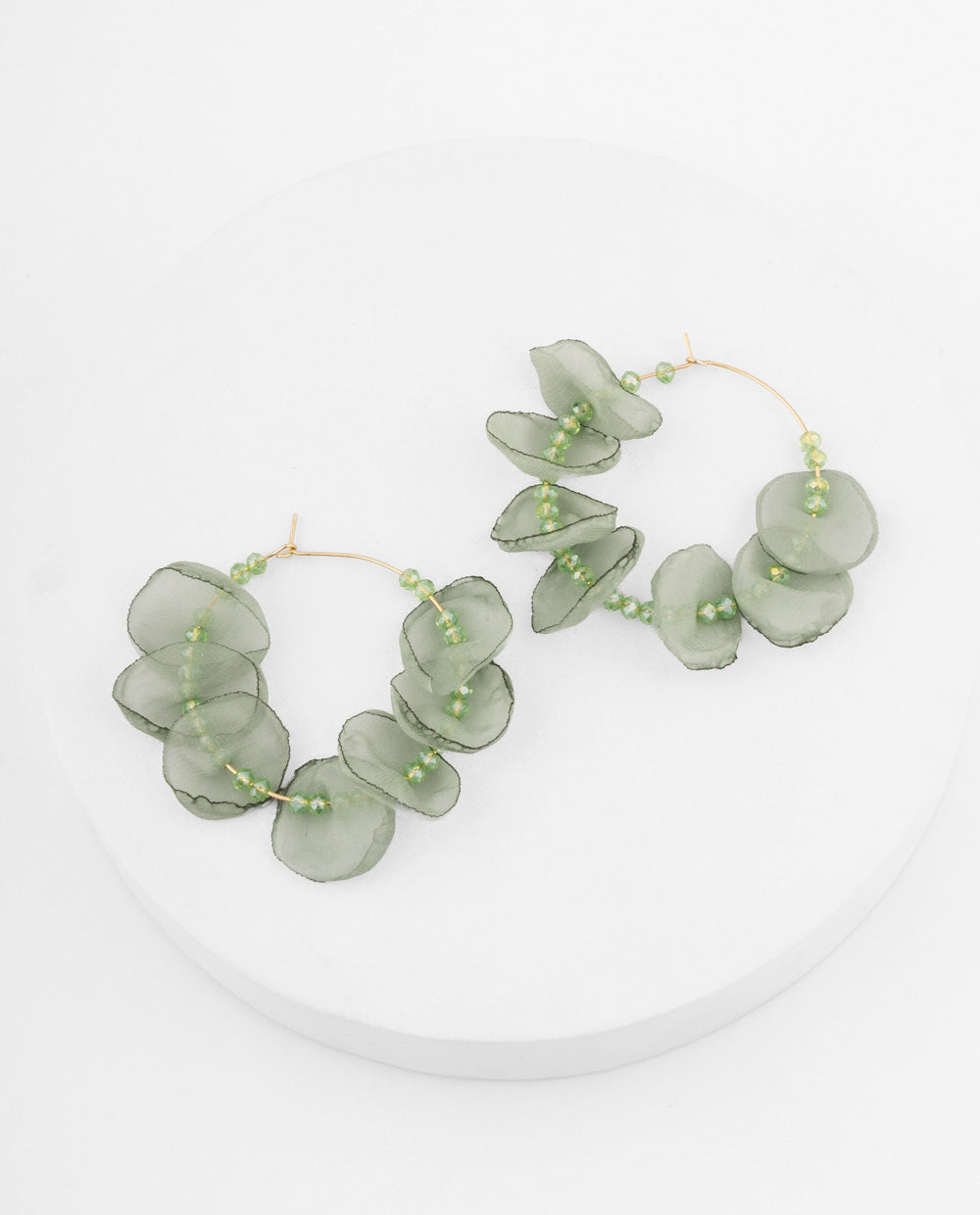 Aretes circulares con pétalos de tela translúcida en tono verde y cuentas decorativas que aportan movimiento y un acabado delicado y femenino.