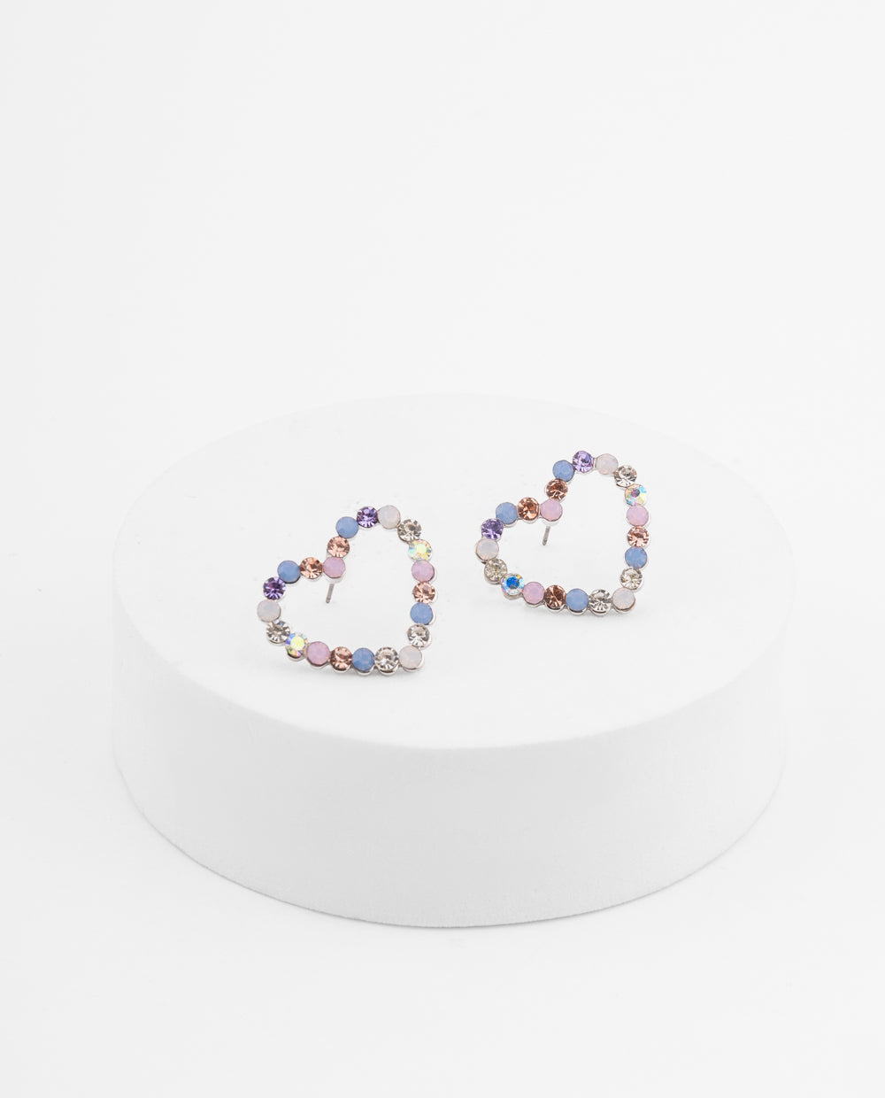 Aretes en forma de corazón con incrustaciones brillantes en tonos azules, lilas y neutros, ideales para complementar looks denim y resaltar en outfits casuales con un toque fashion. Su diseño divertido y femenino los convierte en el accesorio perfecto para sumarse a la tendencia Back to Denim, aportando contraste y frescura.