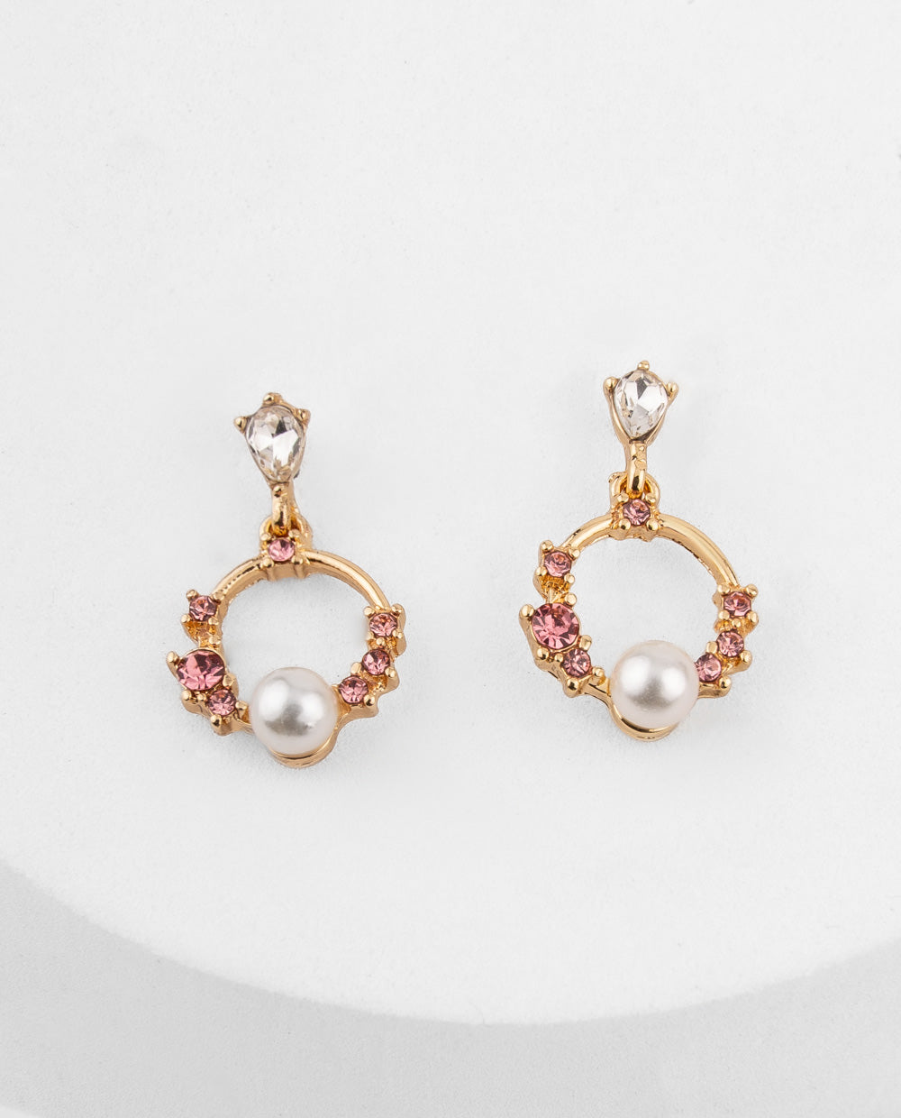 Aretes dorados con diseño de aro decorado con pedrería rosada y detalle de perla al centro. Su estilo femenino y delicado aporta un brillo romántico.