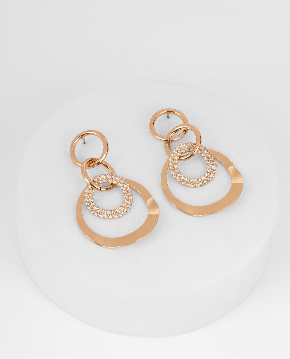 Luce sofisticada con estos aretes de diseño circular en tono dorado, realzados con aros entrelazados y detalles de strass. Su brillo sutil los hace ideales para elevar tu look de día o de noche. Perfectos para sumar un toque chic sin esfuerzo.