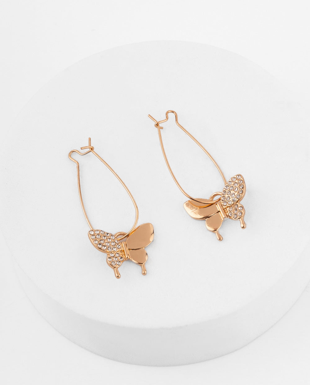 Aretes dorados colgantes con diseño de mariposa adornada con incrustaciones brillantes, que aportan feminidad y movimiento. Su estilo ligero y elegante los hace ideales para destacar en un look casual con denim o complementar un outfit sofisticado de noche. Una pieza encantadora que suma frescura y brillo a tu estilo.