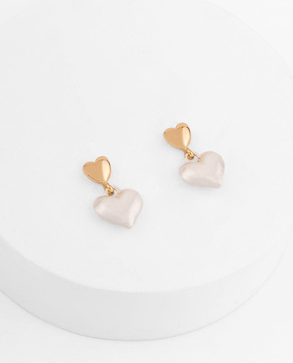 Aretes dorados con diseño de doble corazón, donde el colgante perlado aporta un aire romántico y sofisticado. Su estilo femenino y versátil los convierte en el complemento perfecto para un look casual con denim o para dar un brillo elegante en la noche. Una pieza ideal para quienes buscan un detalle delicado con personalidad.