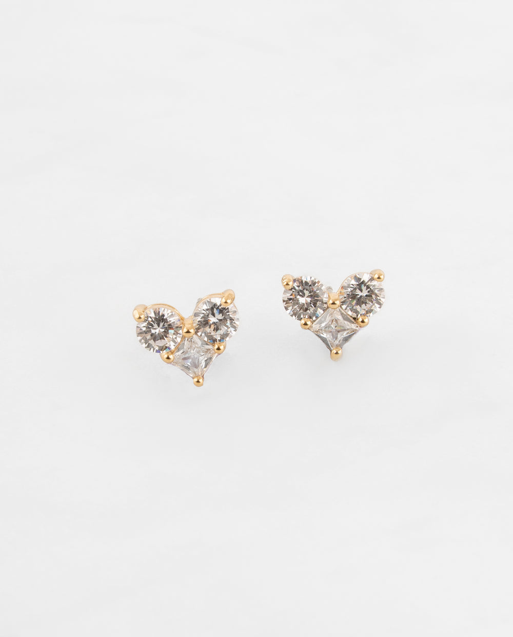 Aretes dorados tipo stud bañados en oro con diseño de corazón formado por pedrería de zircón, perfectos para un brillo delicado y elegante.