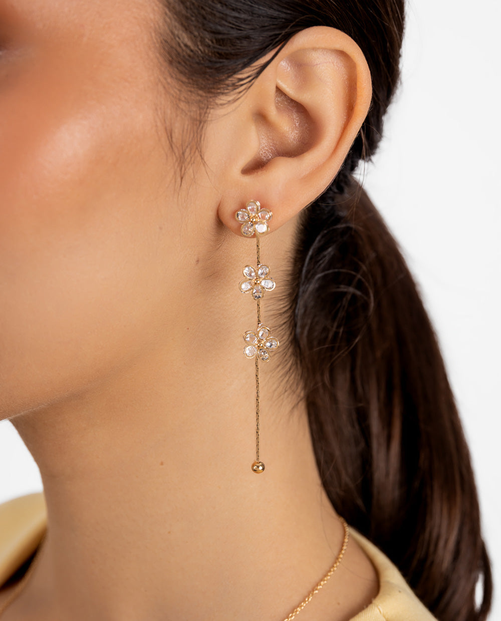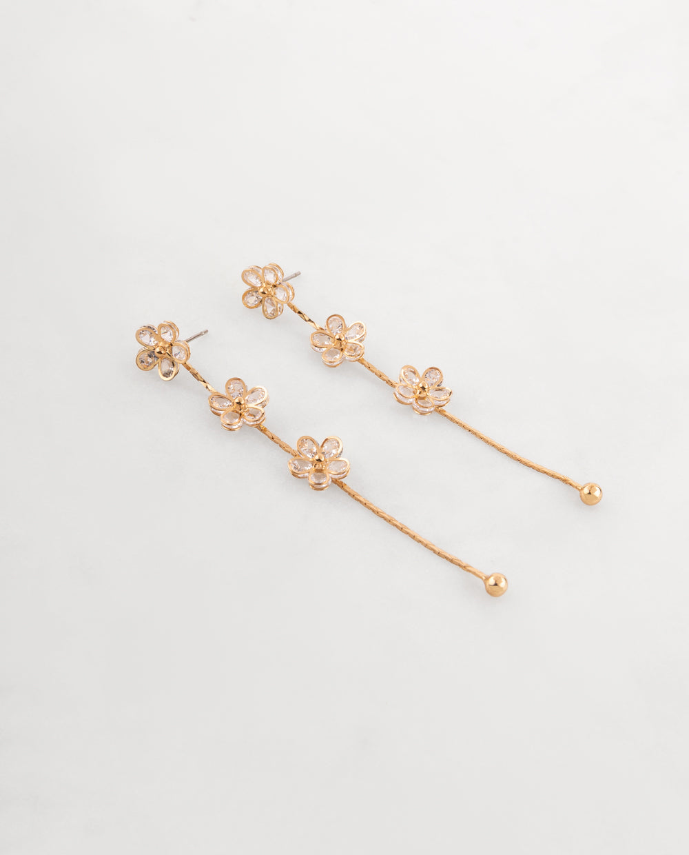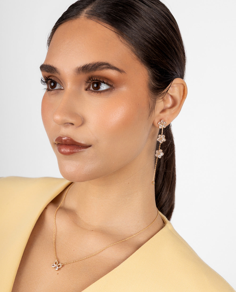 Aretes dorados de diseño floral con delicada pedrería de zircón que ilumina cada detalle. Su caída estilizada aporta un aire romántico y femenino, ideal para ocasiones especiales. Un accesorio que combina elegancia y frescura para resaltar tu brillo único.