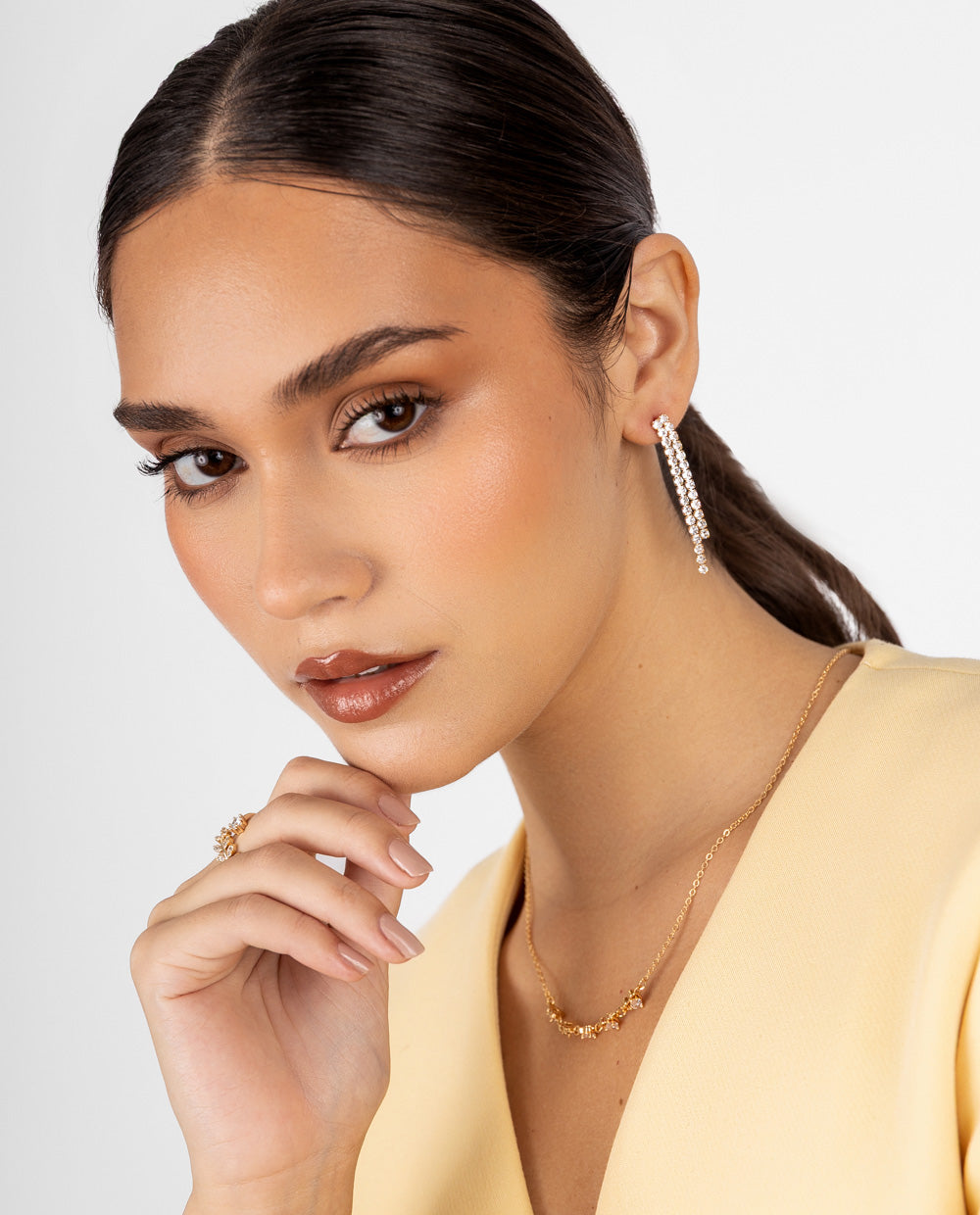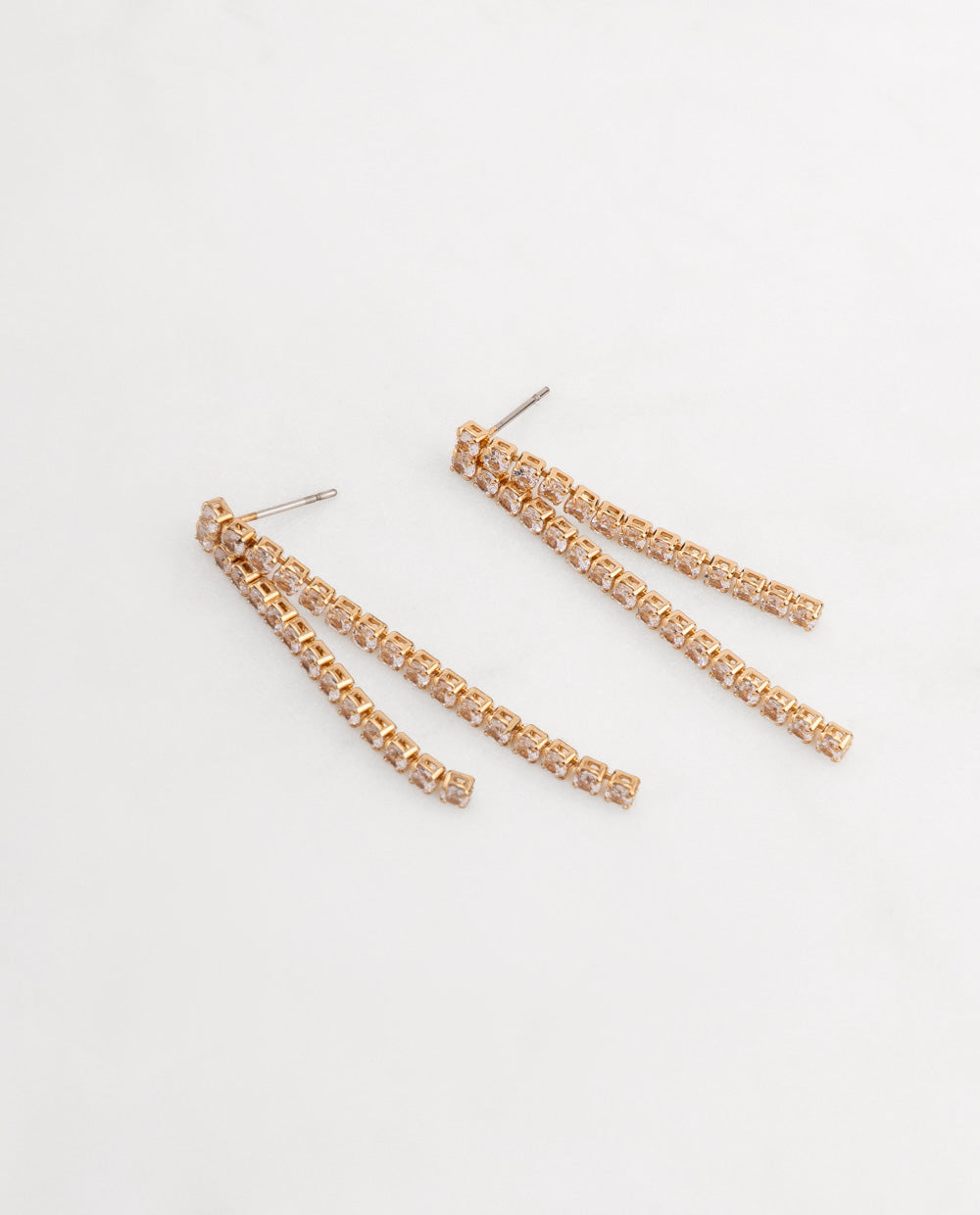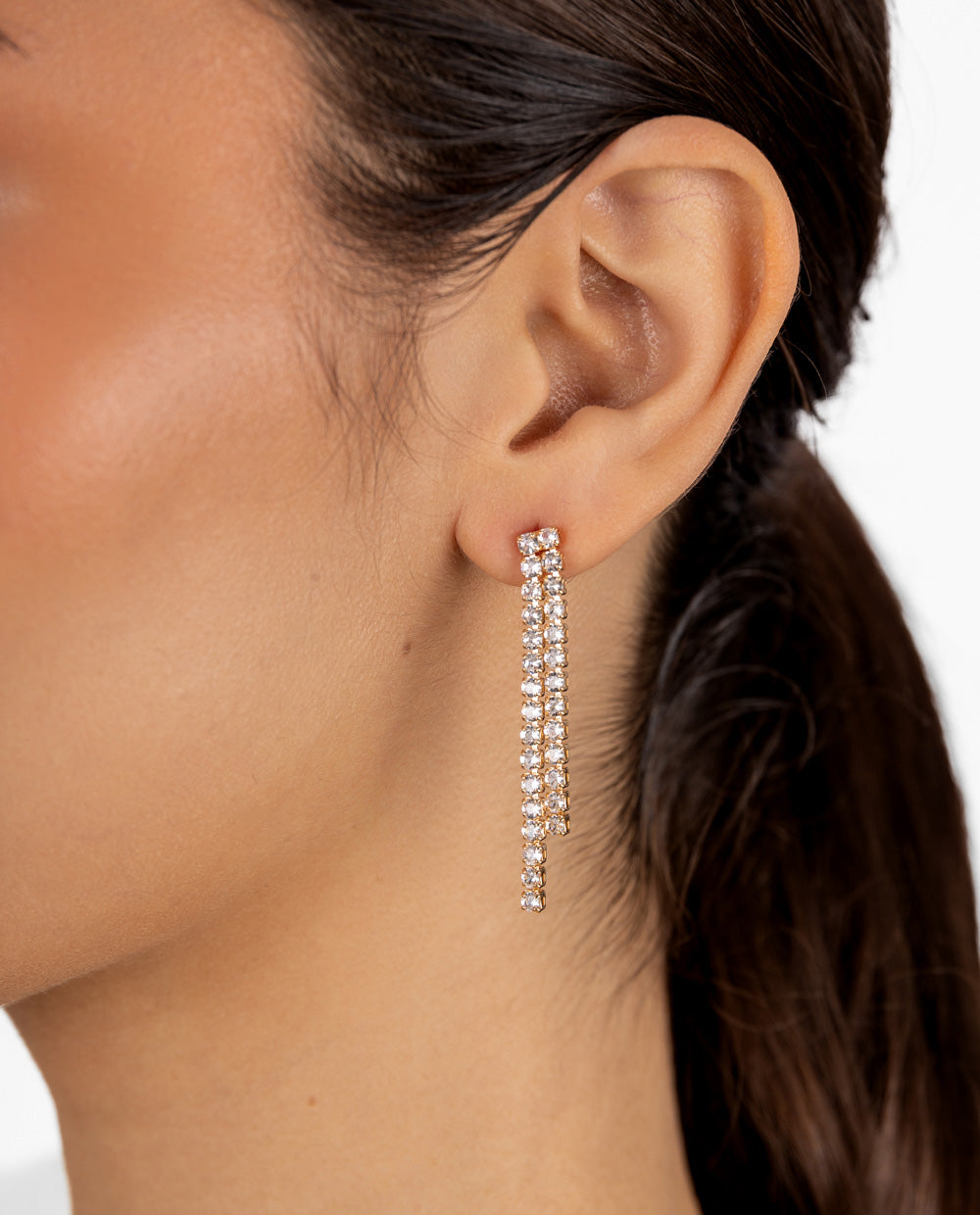 Aretes elegantes con tiras doradas decoradas con pedrería de zircón que reflejan la luz en cada movimiento. Su diseño alargado estiliza el rostro y aporta sofisticación a cualquier look. Perfectos para destacar en eventos de noche o darle un toque glam a tu outfit diario.