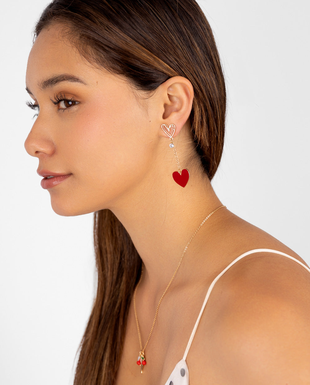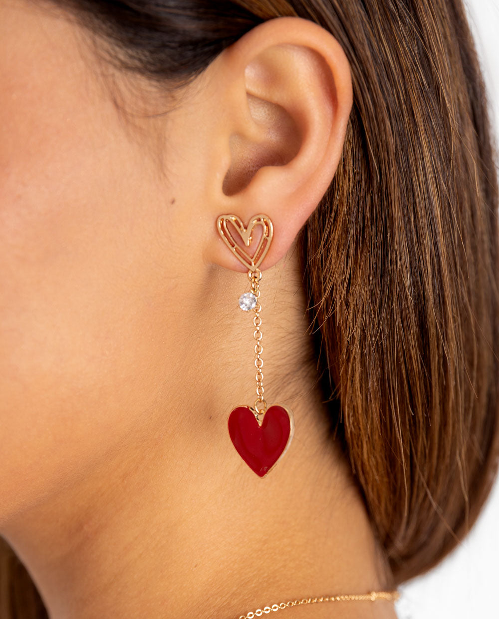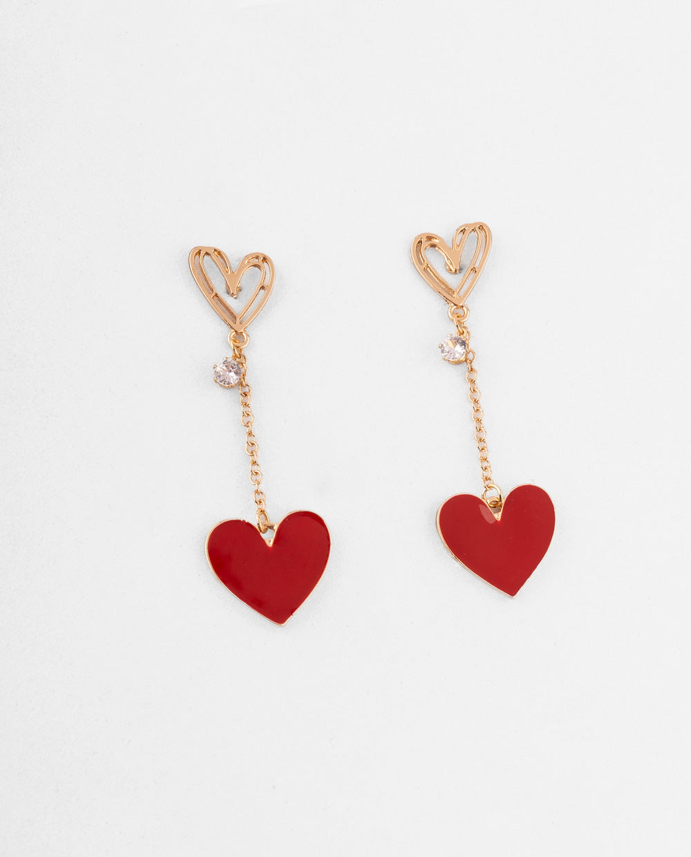 Aretes colgantes con estructura dorada en forma de doble corazón y dije esmaltado en rojo cábala. Incorporan una pequeña piedra brillante al centro que aporta contraste y luminosidad.