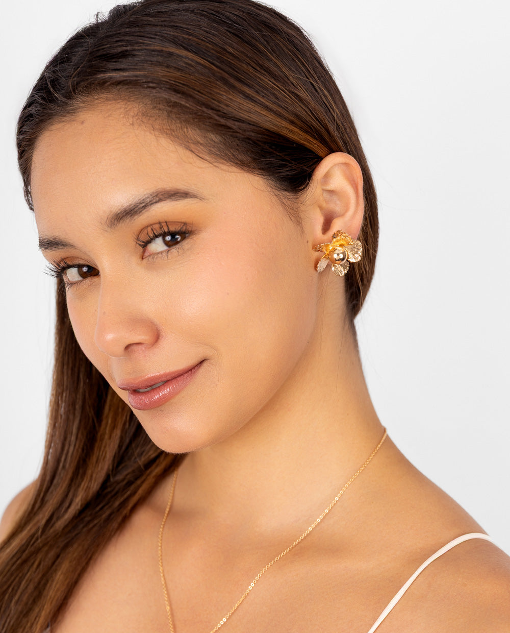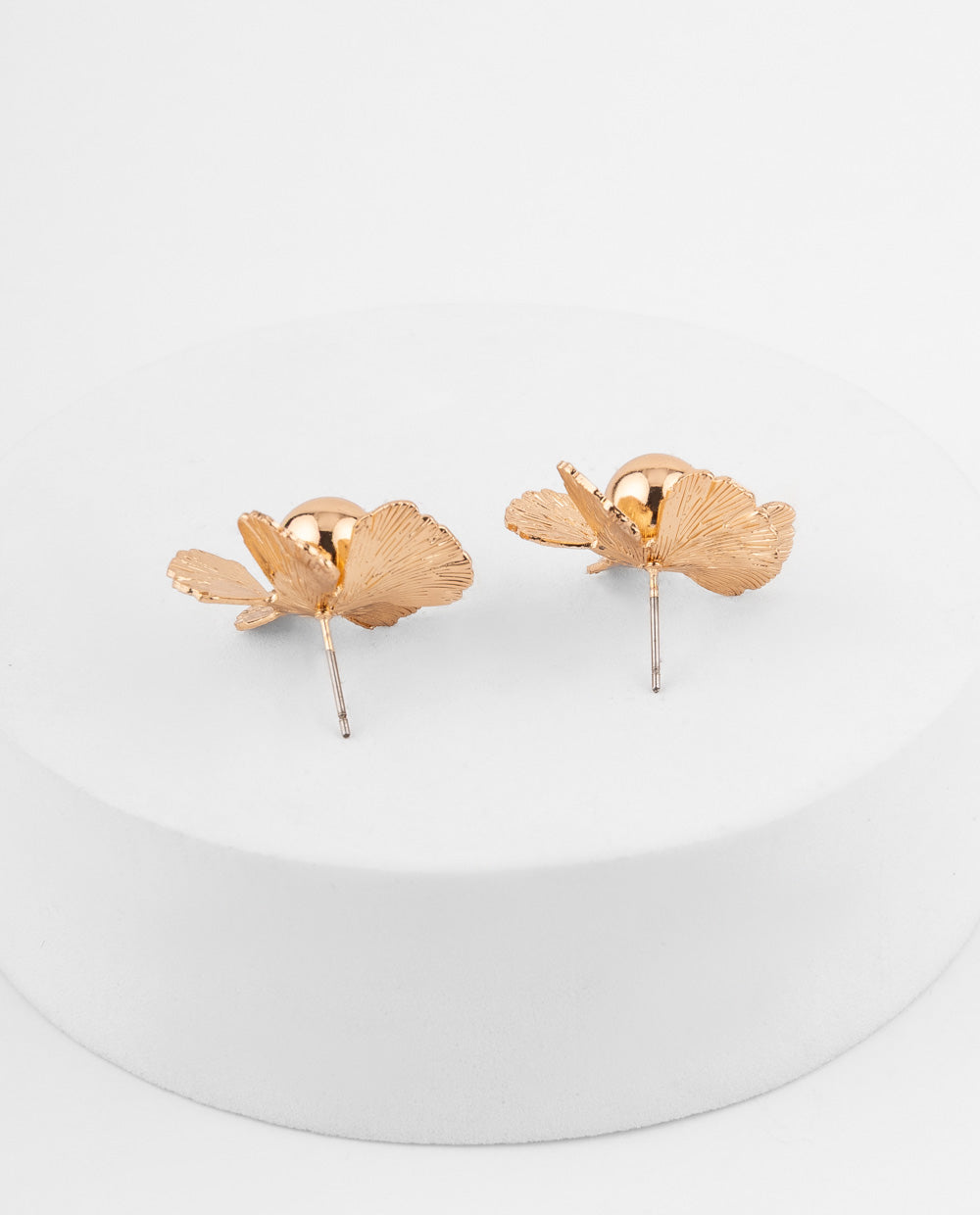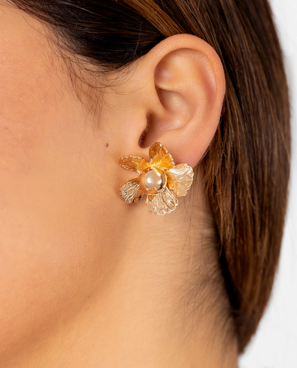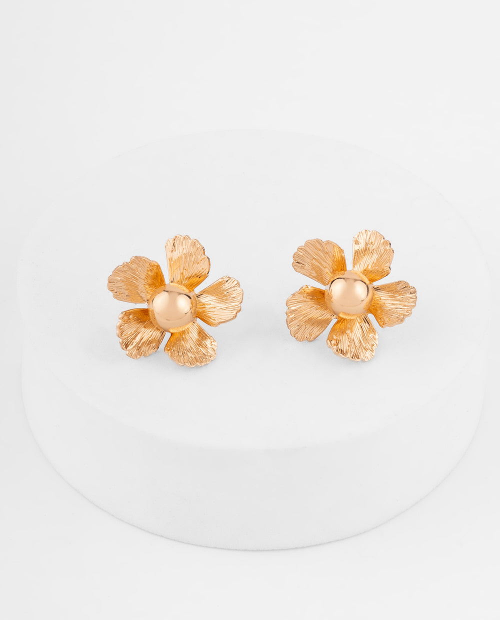 Aretes dorados en forma de flor con cuatro pétalos metálicos de acabado cepillado y centro liso brillante. Elaborados en tono dorado con contraste de texturas que aporta relieve y elegancia.