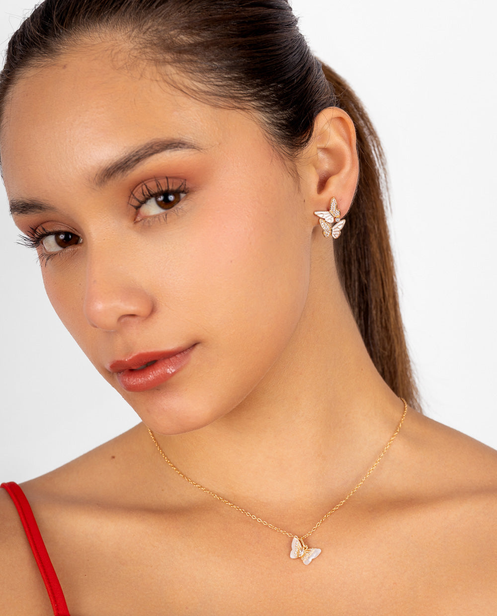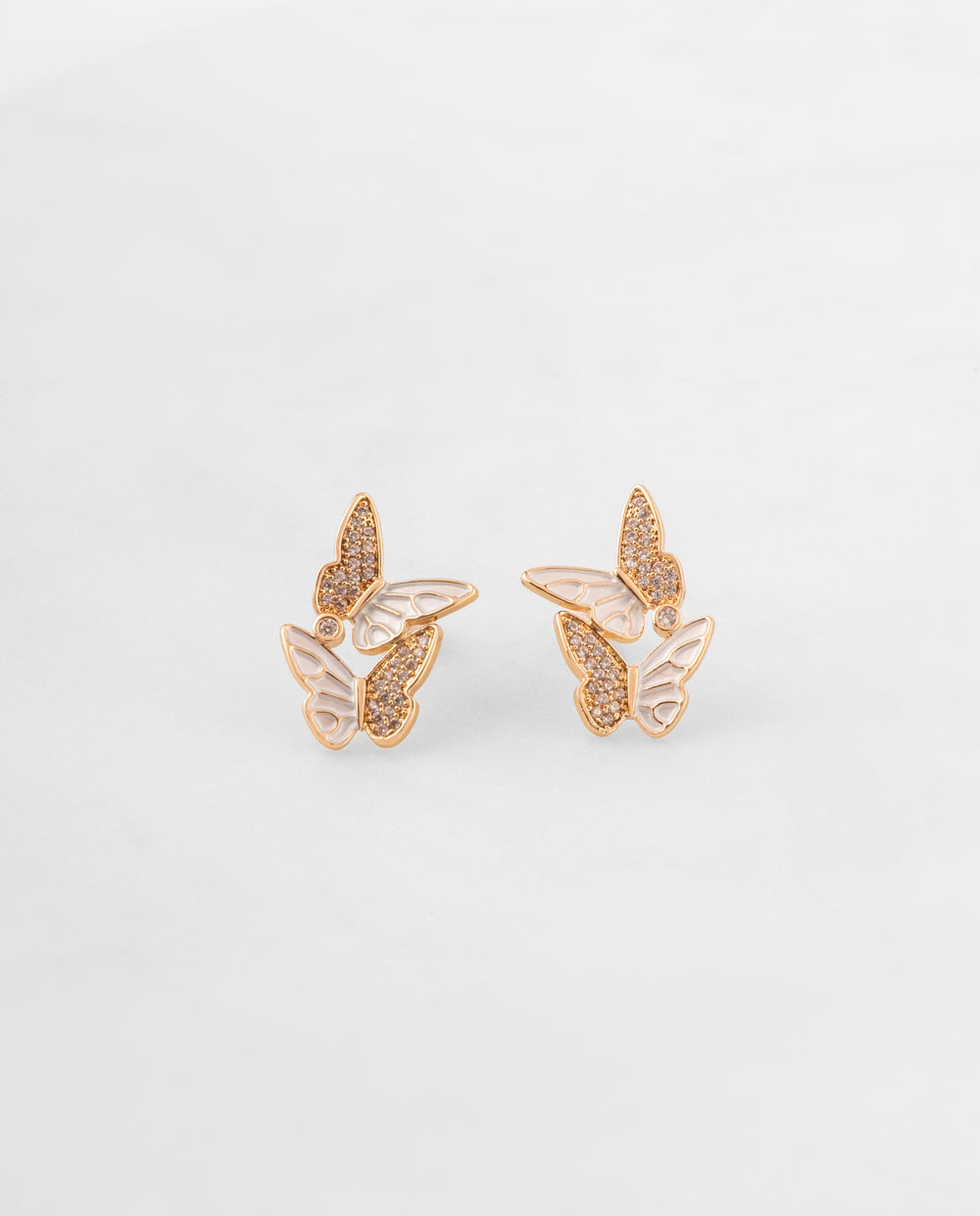 Aretes dorados bañados en oro con diseño de mariposas decoradas con pedrería de zircón. El zircón, reconocido por su brillo y durabilidad, aporta un toque de elegancia y luminosidad.