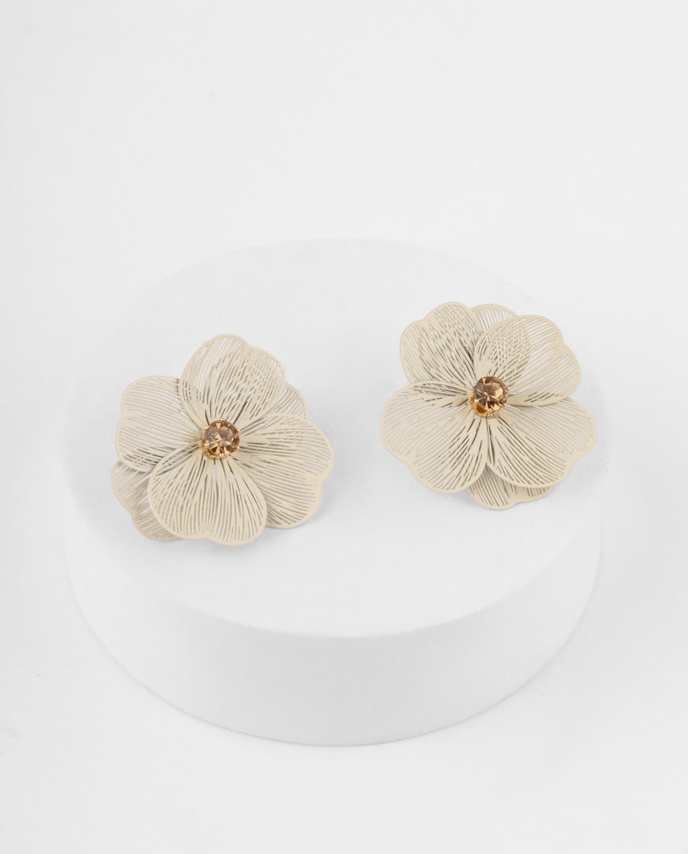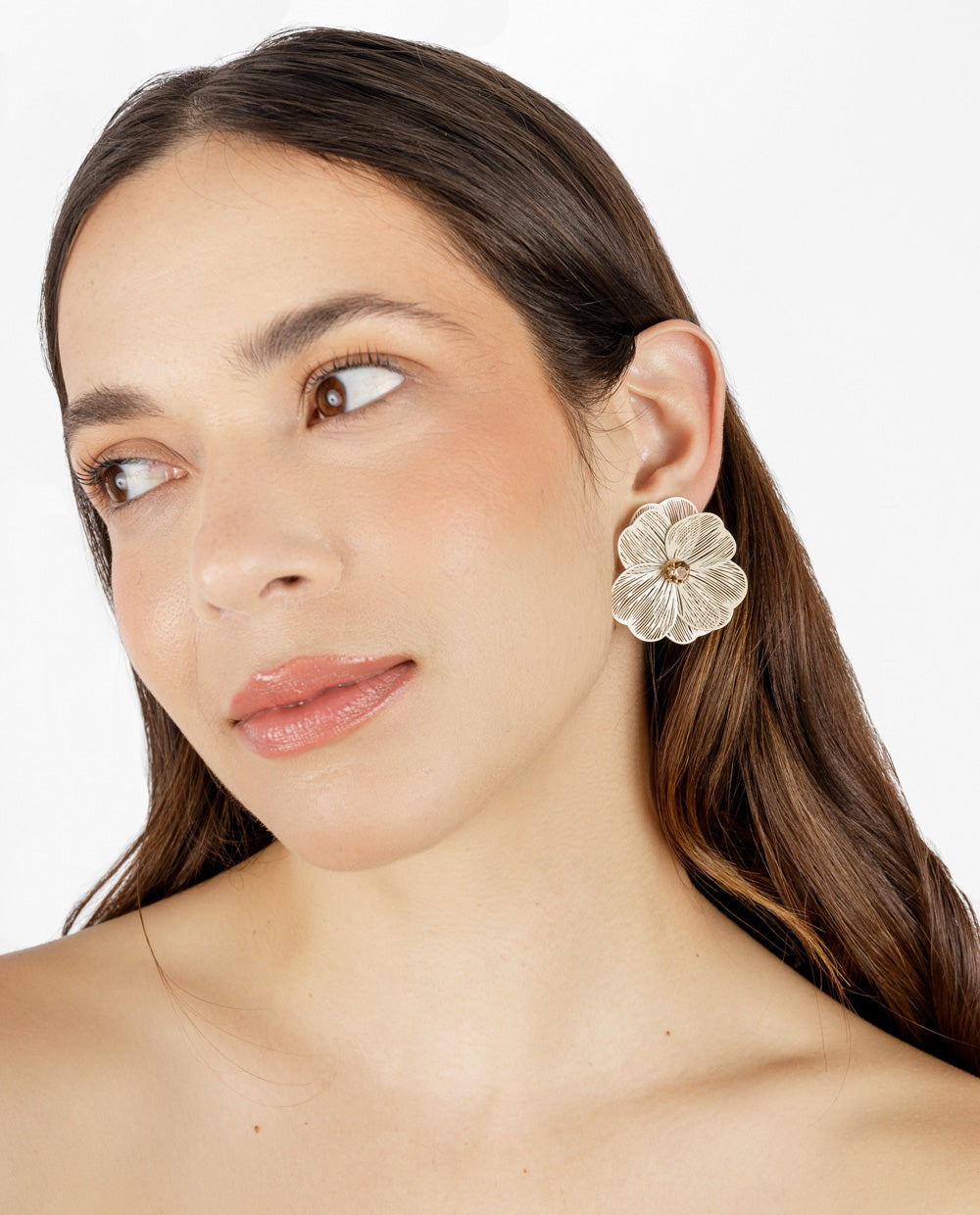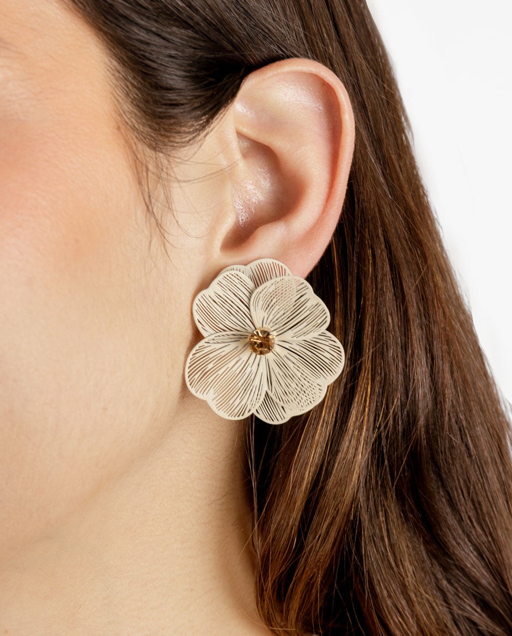 Estos aretes en forma de flor calada en tono beige incorporan un detalle central brillante que realza su elegancia primaveral. Su diseño delicado y ligero los hace ideales para complementar vestidos frescos, blusas románticas o looks casuales con aire boho chic. Un accesorio versátil que suma feminidad y estilo natural en cada ocasión.