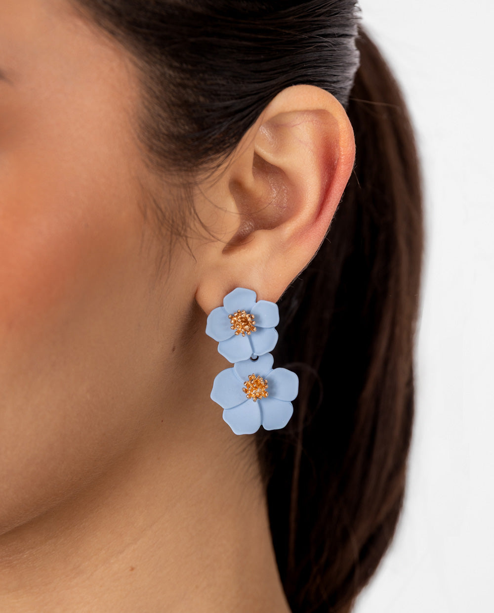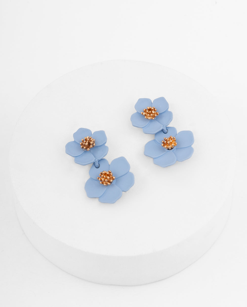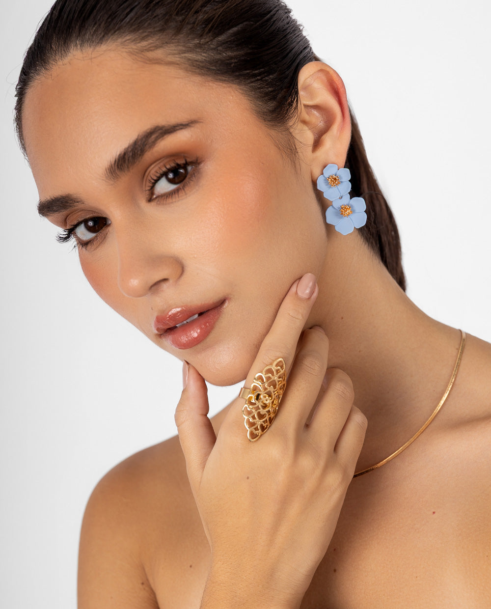 Aretes en forma de flor con pétalos azules mate y centro dorado texturizado, inspirados en la frescura de la temporada. Su diseño llamativo y femenino es ideal para combinar con outfits en denim, aportando un aire juvenil y trendy. Perfectos para elevar un look casual de día o sumar un detalle alegre y moderno en la noche.