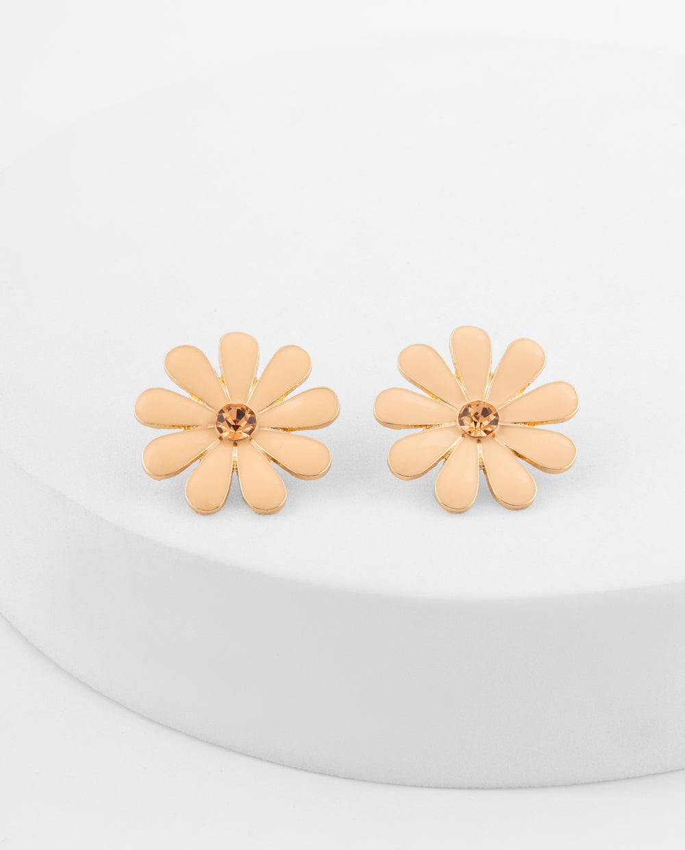 Aretes tipo stud con flor dorada de pétalos lisos y detalle central brillante, perfectos para un toque femenino y radiante.