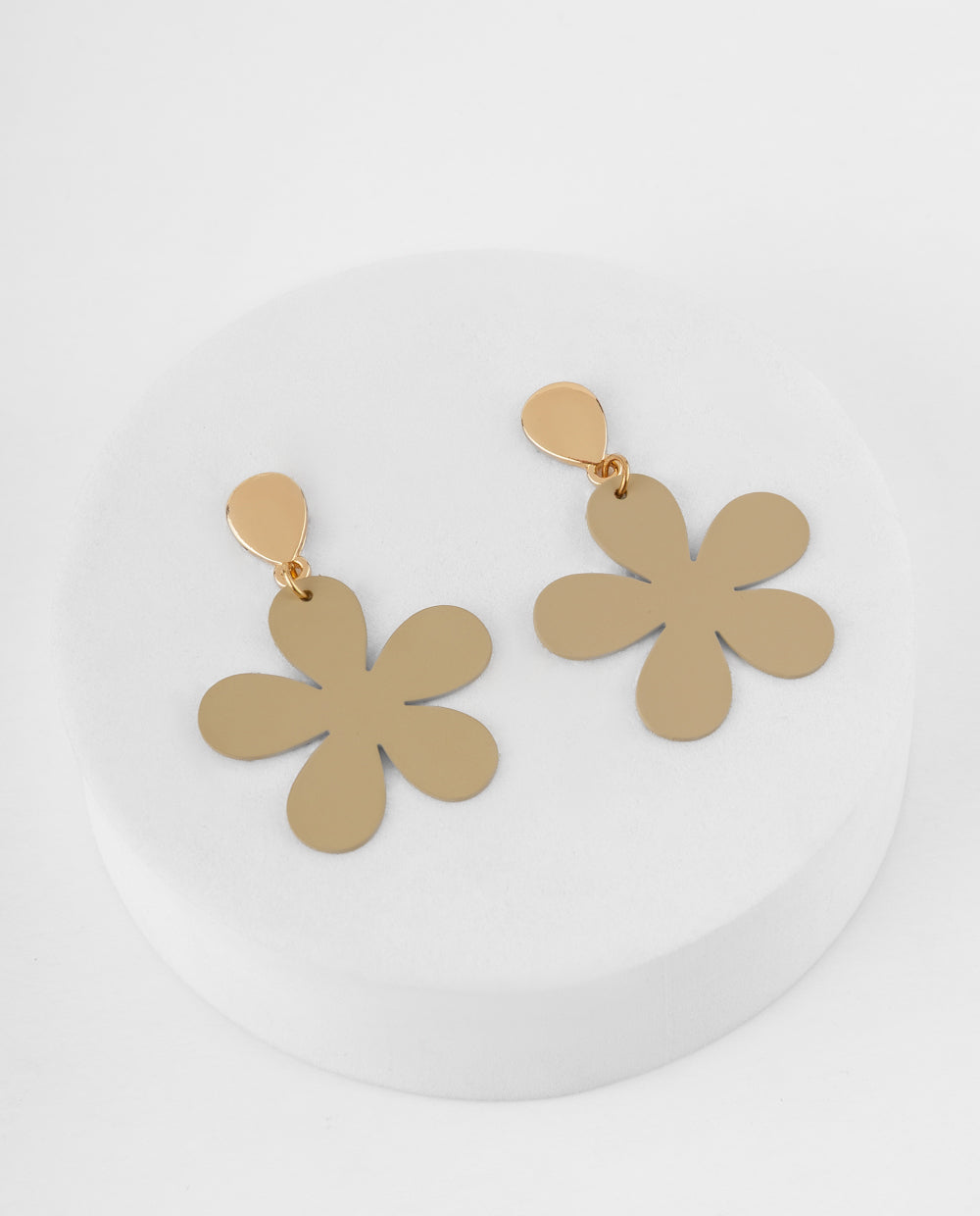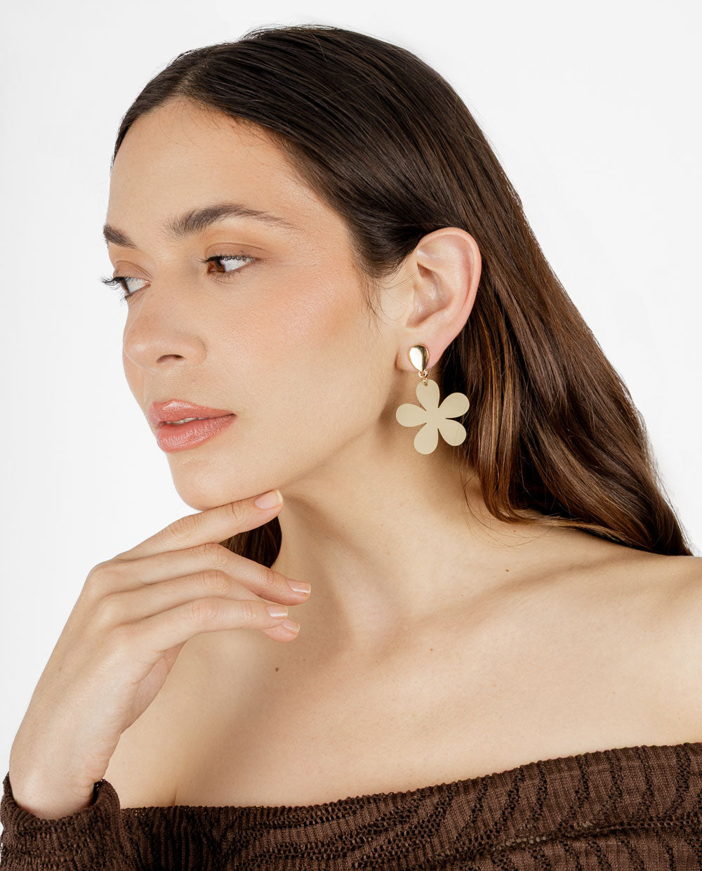 Estos aretes colgantes en forma de flor dorada con pétalos amplios destacan por su diseño minimalista y elegante. Su estilo ligero y moderno es perfecto para combinar con vestidos frescos, blusas románticas o looks casuales con esencia boho chic. Un accesorio versátil que aporta un aire femenino y sofisticado a tu estilo primaveral.