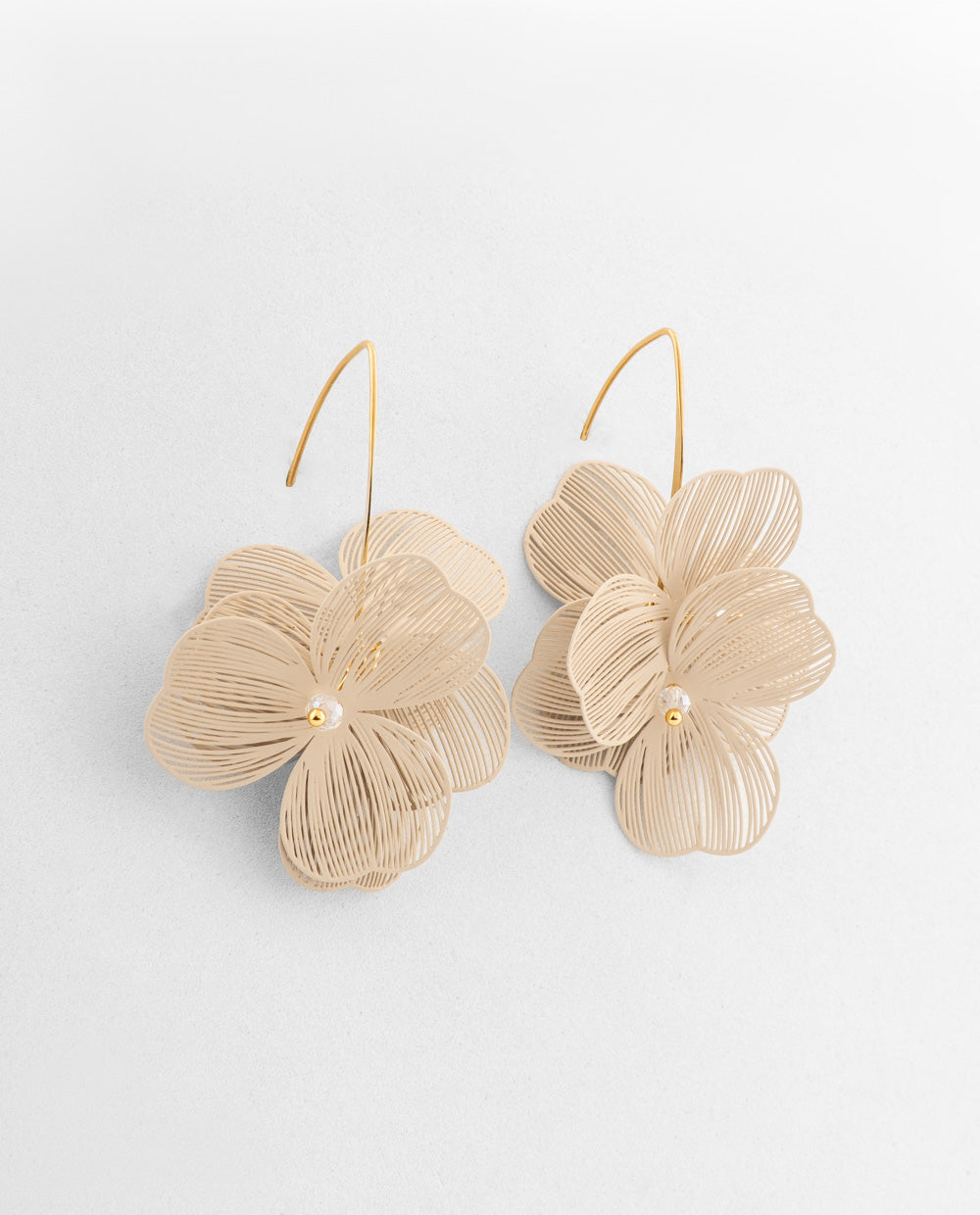 Aretes largos con diseño floral calado y acabado metálico ligero beige, ideales para un look femenino y elegante.