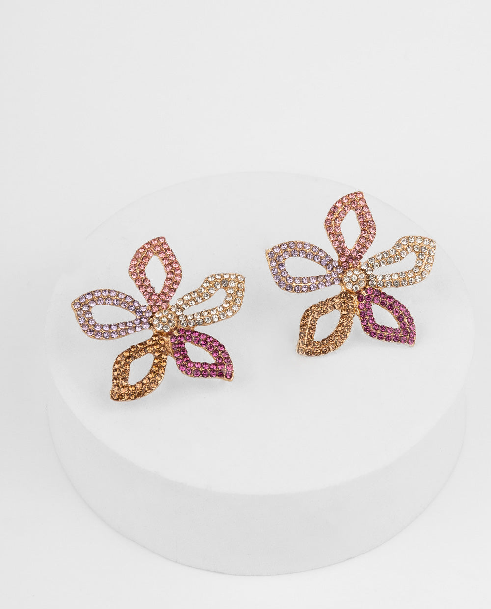 Estos aretes con forma de flor están diseñados para brillar. Cada pétalo combina strass en tonos rosa, lila y dorado que se funden en un delicado degradé. Ligeros pero llamativos, son el accesorio ideal para destacar en cualquier ocasión especial.