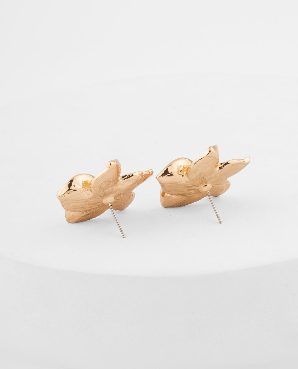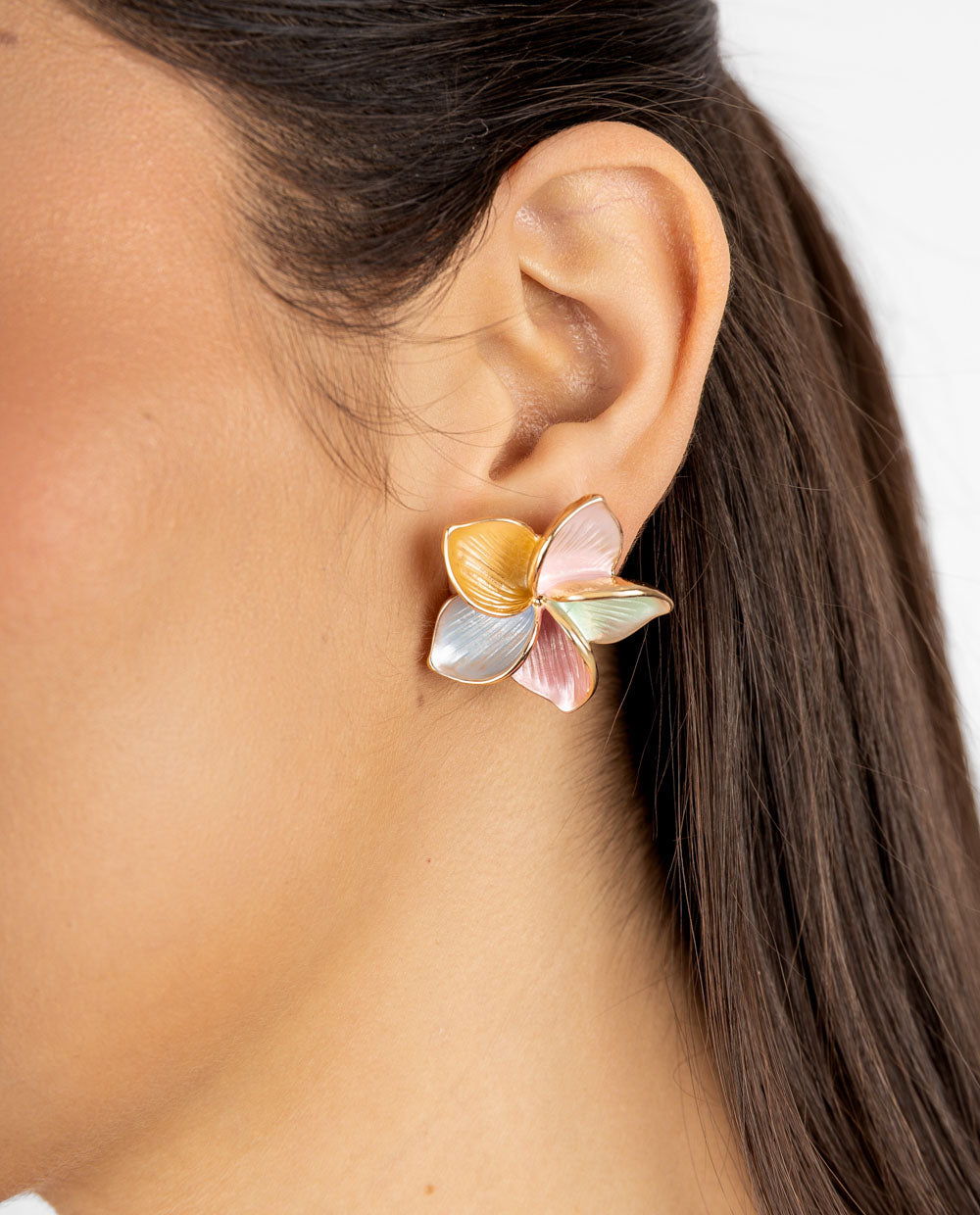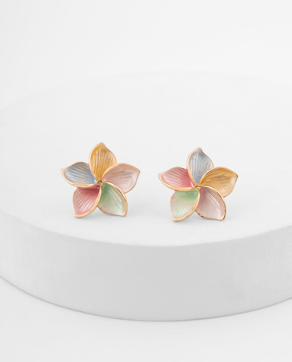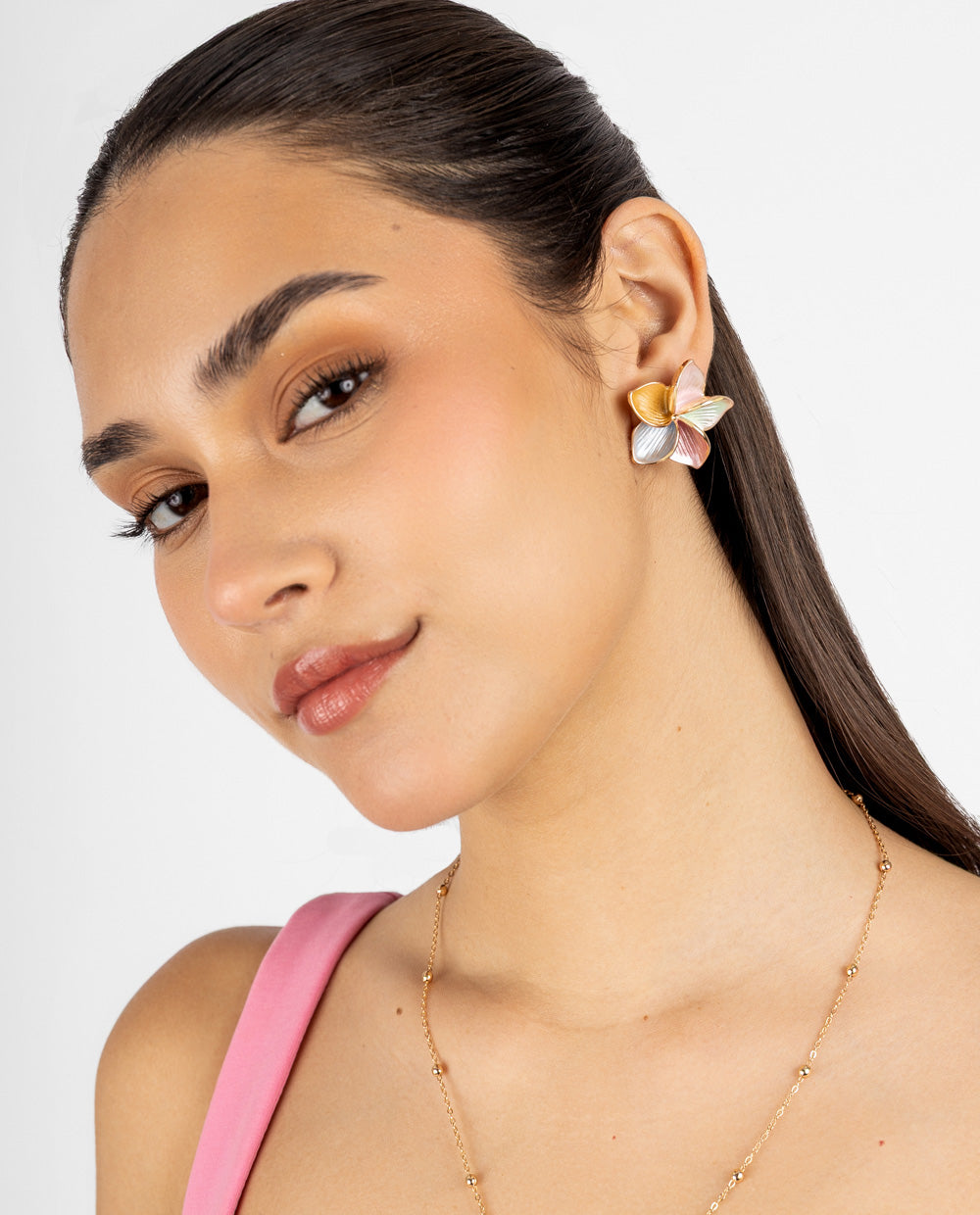 Aretes tipo stud con diseño de flor de cinco pétalos en tonos pastel, acabado esmaltado y bordes dorados que aportan un toque delicado y femenino.