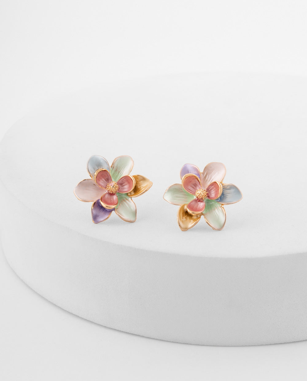 Aretes tipo stud con diseño de flor esmaltada en tonos pastel y detalles dorados, ideales para un toque delicado y femenino.