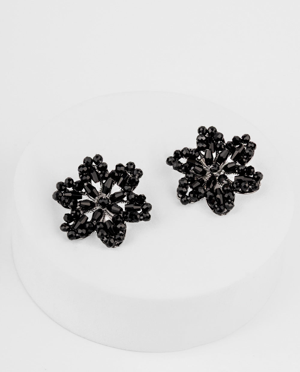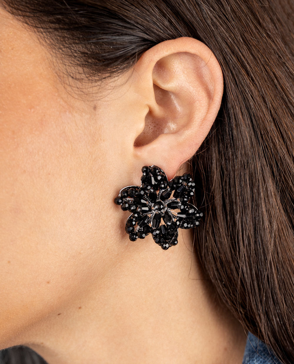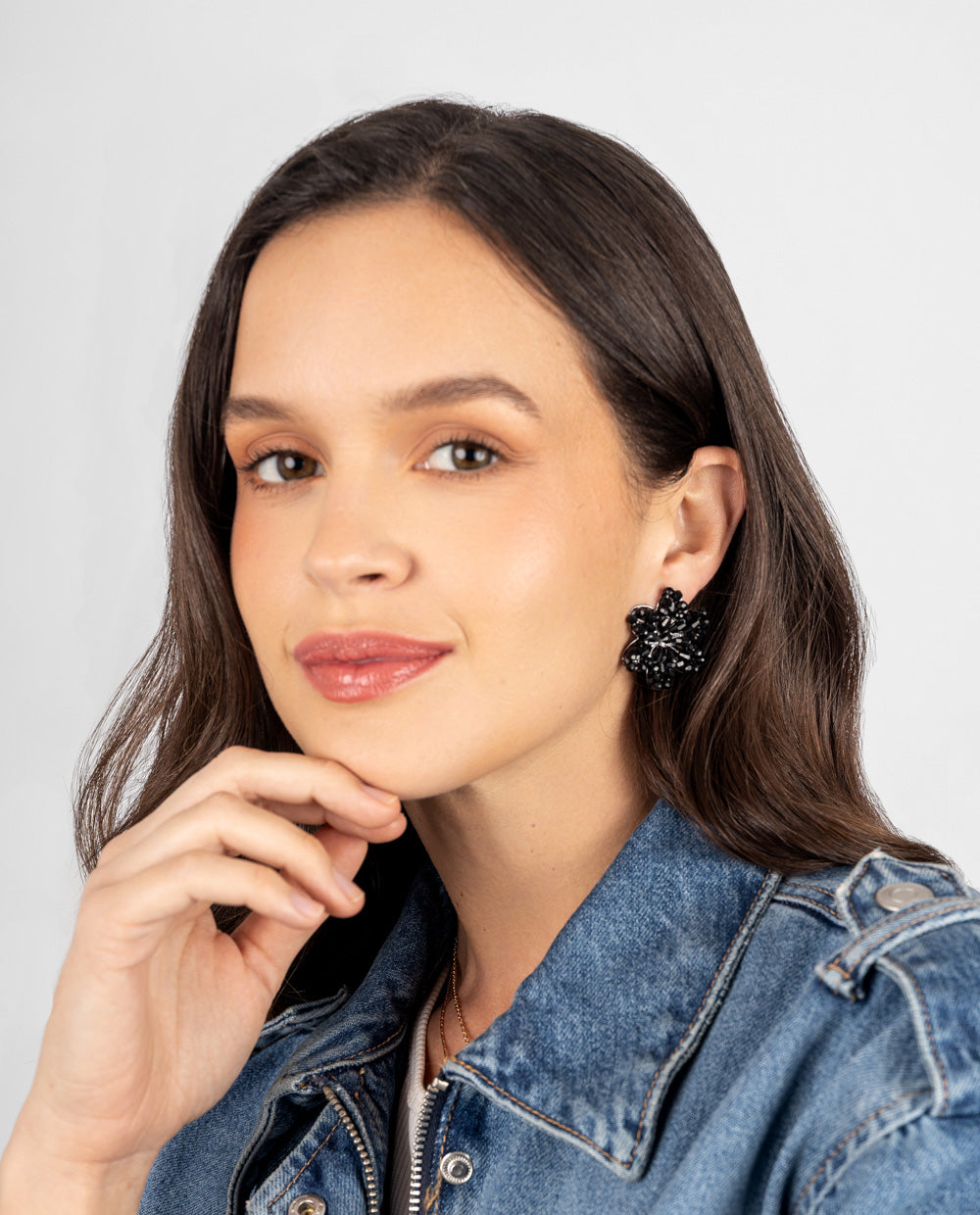 Un toque elegante y sofisticado para tus looks. Estos aretes con forma de flor y detalles en pedrería negra son ideales para realzar tu outfit de noche o darle carácter a un look monocromático. Perfectos para destacar con estilo.