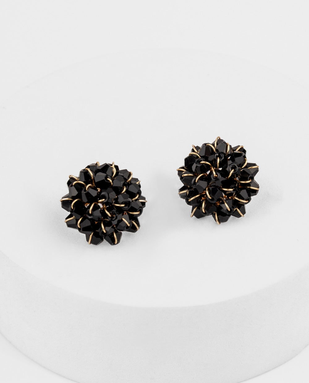 Llenos de textura y brillo, estos aretes en forma de flor negra combinan piedras facetadas con acabados dorados que crean un efecto tridimensional único. Ideales para elevar cualquier look con un toque moderno y elegante.