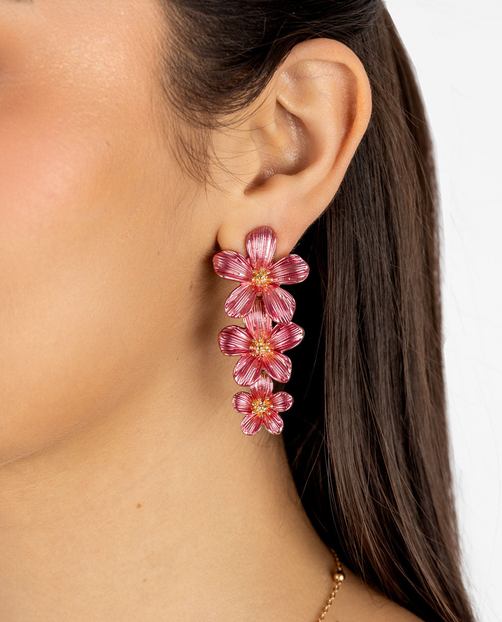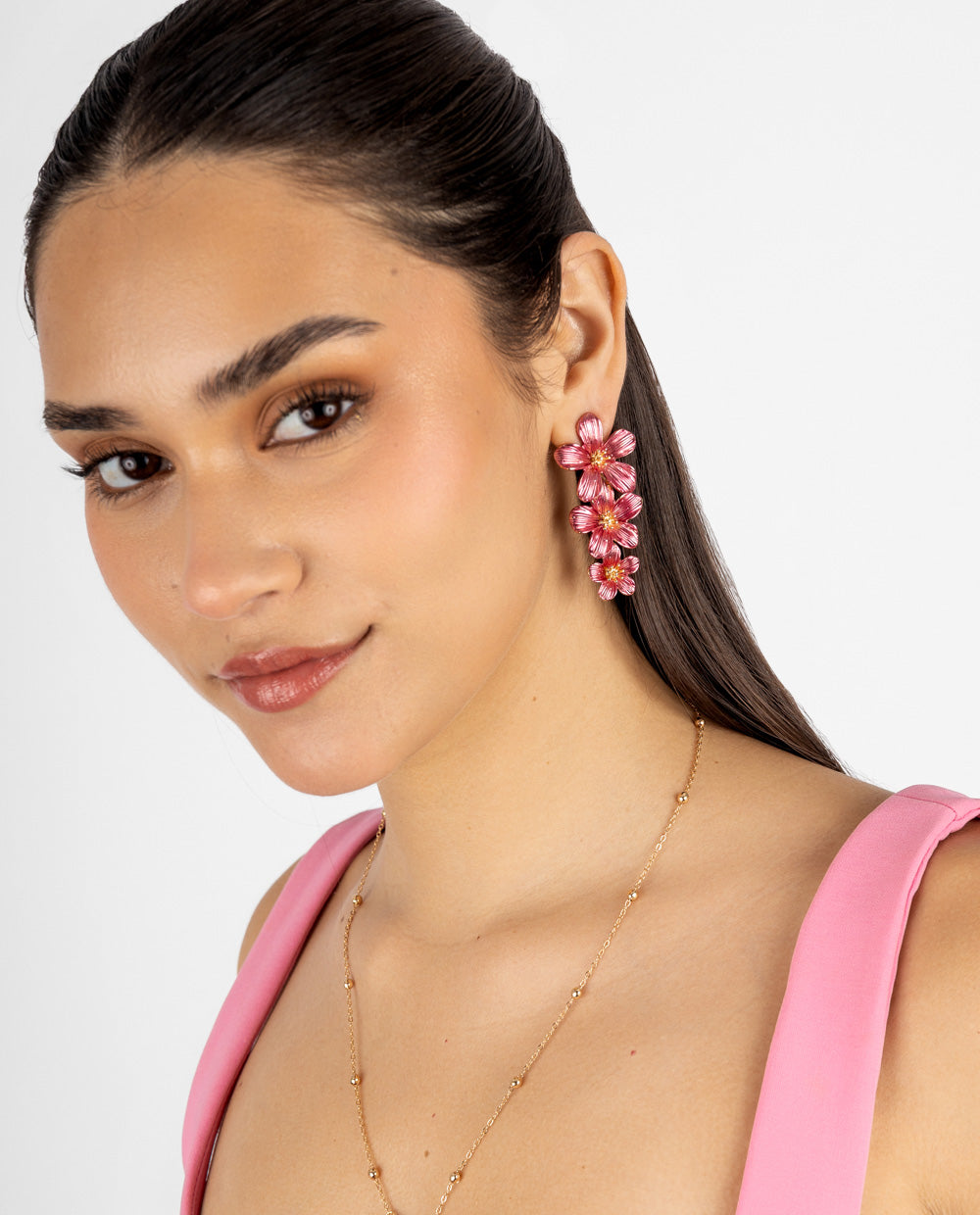 Aretes largos con flores metálicas en acabado fucsia, diseño en caída que aporta brillo y un look delicado y elegante.