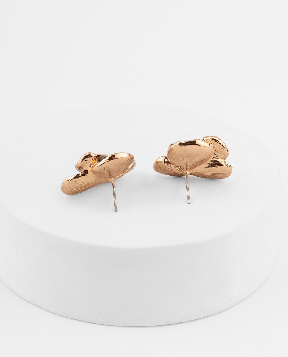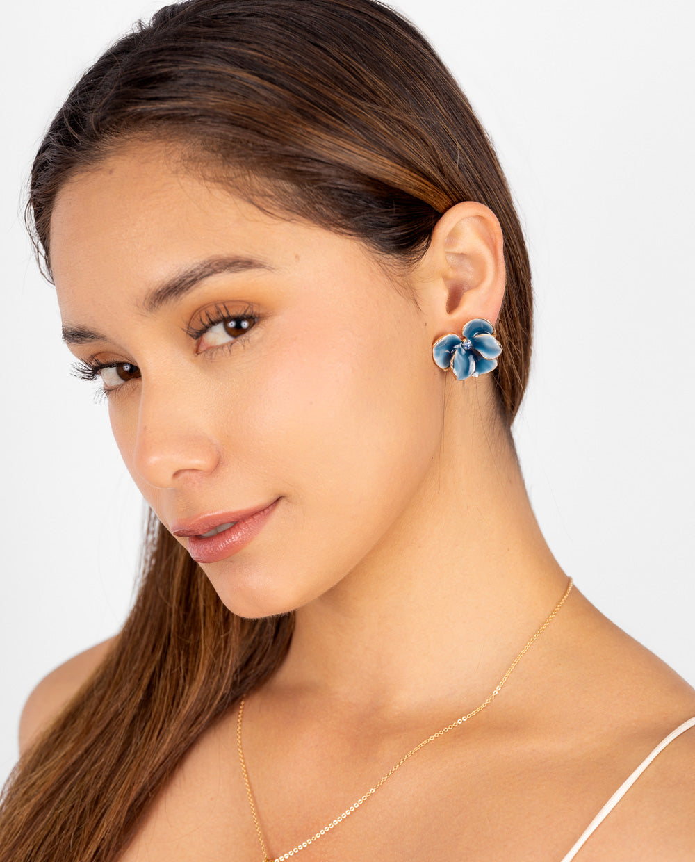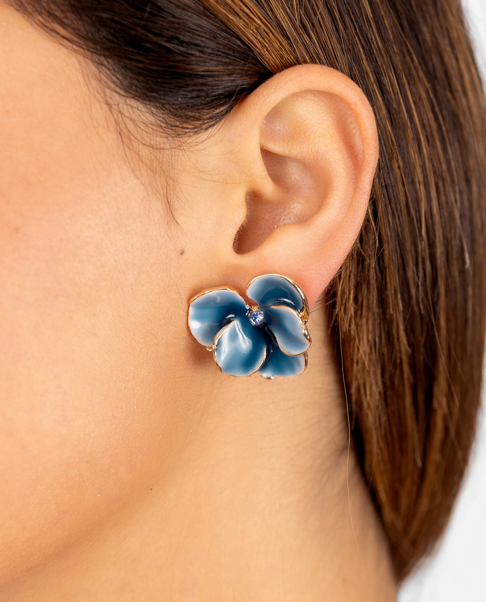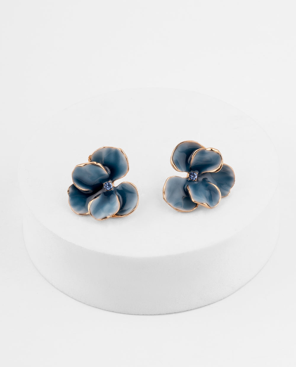 Aretes en forma de flor esmaltada en tono azul grisáceo con bordes dorados y centro de cristal azul. Diseño tridimensional con acabado brillante que resalta por su detalle artesanal.